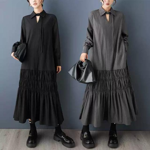 シャツワンピース レディース ギャザー ワンピース ロング 長袖 モード プリーツ シャツワンピ 無地 個性的 モード系 pLegLad ドレープ ワイド 体型カバー 春 秋 冬 20代 30代 40代 50代