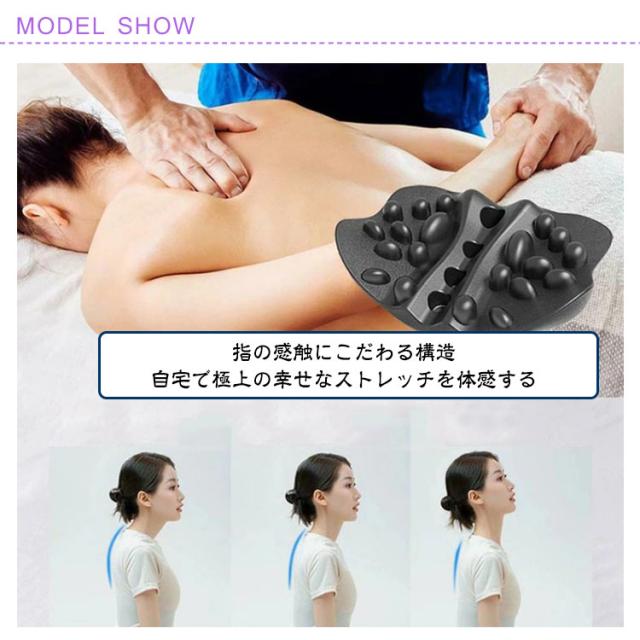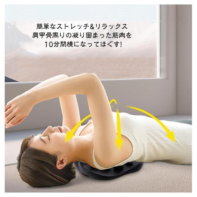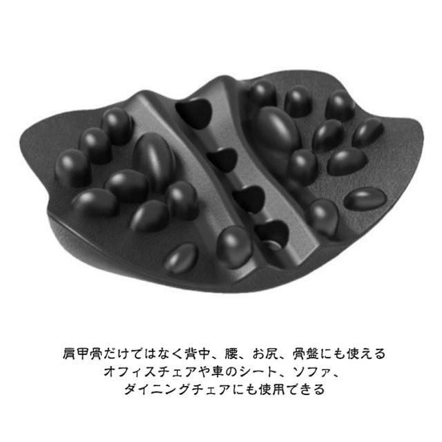 | ツボ押し効果で肩甲骨スッキリ!ラクナピローで健康生活。 指の感触にこだわる構造 自宅で極上の幸せなストレッチを体感する ポイント1 20個の突起で筋肉を刺激整体師の指圧を自宅で体感 ポイント2 前後+突起の立体刺激設計 正面:広範囲で背中をしっかりサポート 背面:フィット感抜群で心地よく伸ばす 突起部:指圧のようにピンポイントで刺激 人間工学に基づいた凹凸 コリを伸ばす姿勢がよくなる 湾曲カーブが肩甲骨を伸ばす ポイント3 “ゆらゆら”構造 慣れてきたら図のように左右に揺れて体重をかけると、より効果を実感できます。 ※無理せずゆっくりと行ってください。 ポイント4 肩甲骨だけではなく背中、腰、お尻、骨盤にも使える オフィスチェアや車のシート、ソファ、 ダイニングチェアにも使用できる 簡単なストレッチ&リラックス 肩甲骨周りの凝り固まった筋肉を 10分間横になってほぐす! | |