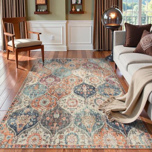 HAOCOO ラグ カーペット 洗える 140×200cm ホットカーペット対応 絨毯 モロッコ柄 ラグマット 1.5畳 ふわふわ オールシーズン適用 滑り止め 防ダニ 防臭 防音 リビング ダイニングマット アンティーク ペルシャ風 カラフル