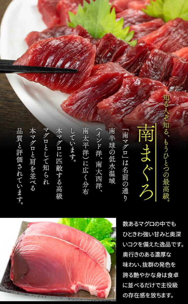 コクのある濃厚な旨みと甘み、もっちりとした食感。本マグロに次ぐ高級種「南マグロ」お刺身カット済で可食部100%。1パック80gずつの小分けになっていますので使いやすさも抜群。解凍も自然解凍OK。手巻き寿司や鉄火丼などに。