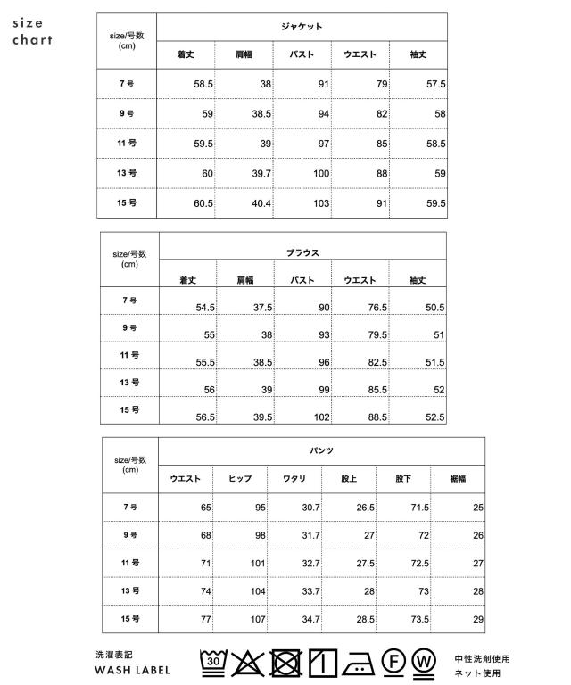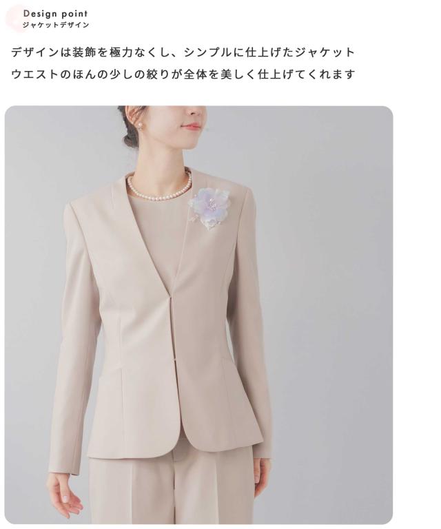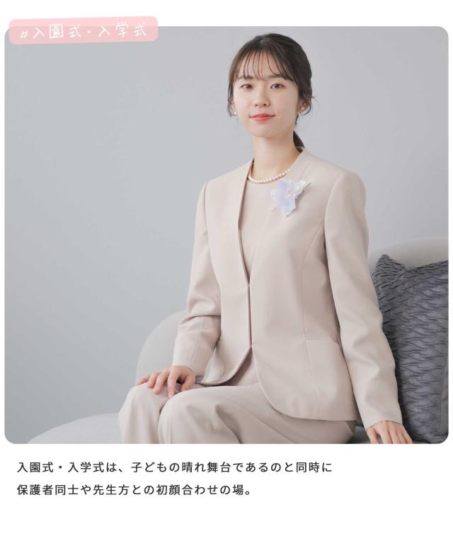 | 特徴 | さまざまな学校行事の中でも特に格式が高く、 厳かな雰囲気が漂う、卒業式や卒園式。 入園式・入学式は、子どもの晴れ舞台であるのと同時に 保護者同士や先生方との初顔合わせの場。 お子様の晴れ舞台である特別な日に彩りを添える シーンに相応しいカラーフォーマル。 堅苦しくなく、おしゃれに見える、そんな洗礼された3点フォーマルスーツ。 華やかすぎず、でも程よくおしゃれ。 着るだけで体型をカバーしてくれるシルエット。 アクセサリーを華やかに、卒園式、卒業式に。 ブラウスに明るい色を入れて、入学式、入園式に。 式典の後も、ブラウスをニットやカットソーに変えて学校行事やビジネスに そのほかにも、七五三や結婚式のお呼ばれにも着回しが◎ デザインは装飾を極力なくし、シンプルに仕上げたシルエットに拘ったジャケット ウエストのほんの少しの絞りが全体を美しく仕上げてくれます。 体のラインを拾いにくい程よい太さのセミワイドパンツ ジャケットとのバランスが良くストンと落ちるパンツは シルエットをスラッと細く見せてくれます。 バックスタイルが美しく見えるサイドゴム仕様 ゴムを両脇につけることで楽な履き後心地を叶えながら 生地が後ろに寄らず、後ろ姿を美しく見せてくれます。 ジャケットを脱ぐとペプラムが可愛い印象のブラウス 背中のファスナー部分にあしらったサテンテープがアクセントに 3点セットはもちろん、ブラウス・パンツの2点セット、 ブラウスを白色に変えて、など好みに合わせて使い分けが叶います。 ※ブラックはブラックフォーマル専用素材なので、 卒業式などの式典だけでなく、喪服・礼服としても使いいただけます。 |