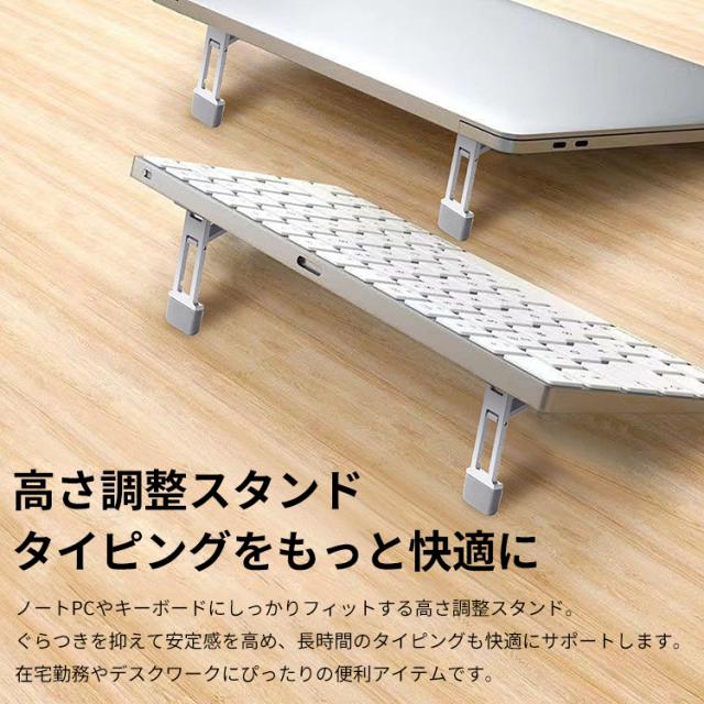 ノートパソコンやキーボードにしっかりフィットする高さ調整スタンド。 ぐらつきを抑えて安定感を高め、長時間のタイピングも快適にサポートします。 在宅勤務やデスクワークにぴったりの便利アイテムです。