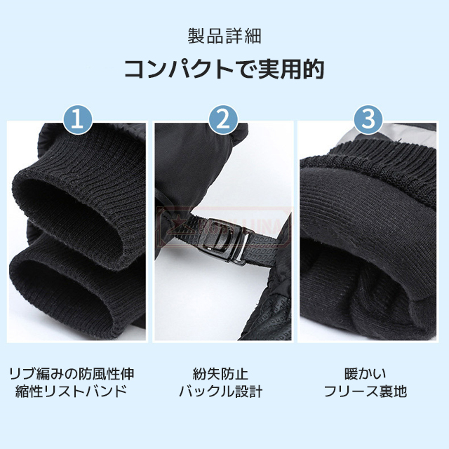 | 手首のフィット感を調整できるマジックテープ&伸縮カフ | ◆手首部分には調整可能なマジックテープと伸縮性ゴムを採用。お好みの締め付け具合に調整でき、雪や冷たい風の侵入をしっかりブロックします。コンパクトながら、優れた防寒性を発揮し、手首に優しくフィットして動きやすさを保ちます。 |