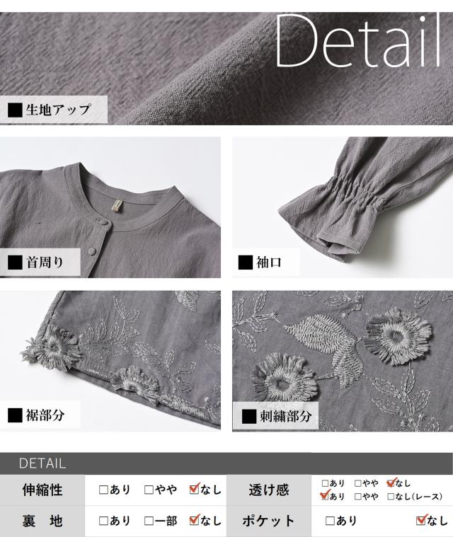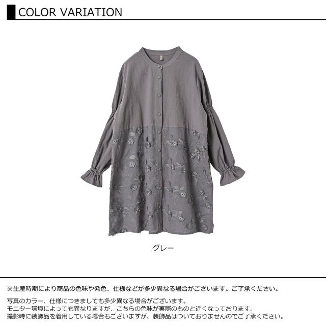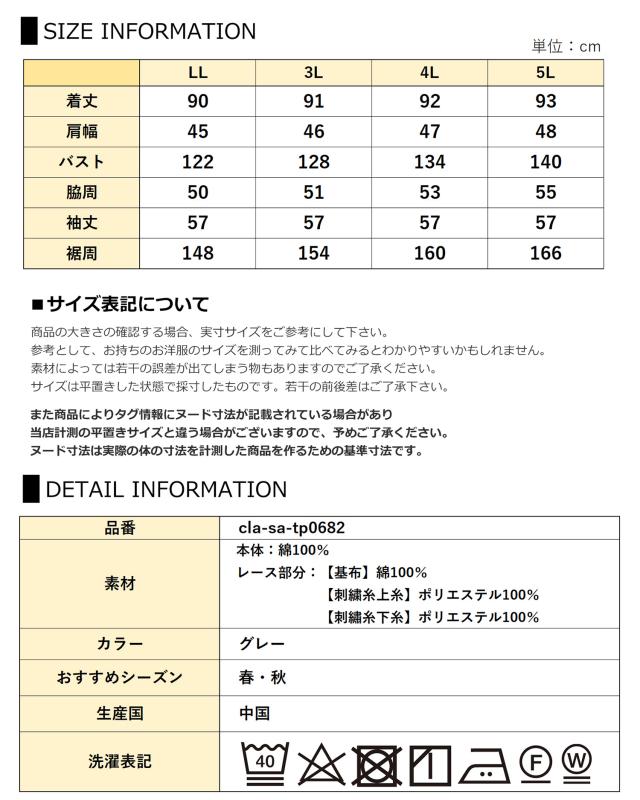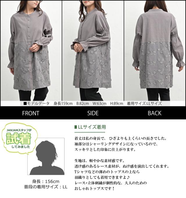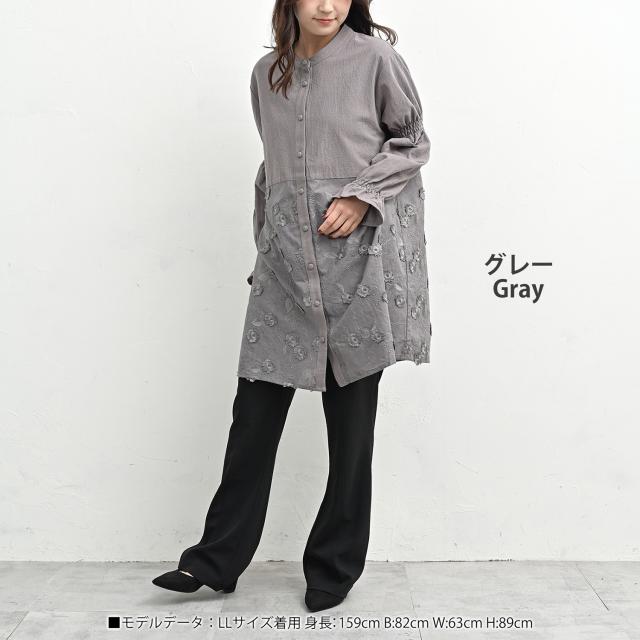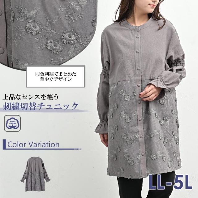 cla-sa-tp0682 清楚可憐な立体感の刺繍切り替えチュニック。 大きいサイズ レディース 長袖トップス 長袖チュニック 長袖ブラウス コットンブラウス チュニックブラウス シャツブラウス 花柄刺繍レース切り替え 立体刺繍 透け感 バンドカラー Uネック クルーネック ラウンドネック 丸首 長袖 ロングスリーブ キャンディスリーブ ギャザースリーブ 袖口フリル 前開きボタン フロントボタン くるみボタン ラウンドヘム 春服 秋服 春物 秋物 春トップス 秋トップス 春シャツ 秋シャツ 春秋トップス コットン100% cotton100 裏地なし 透け感 長め丈 お尻が隠れる着丈 お尻すっぽり丈 チュニック丈 スイーツシャツ ゆったり 大きめ 大人 カジュアル フェミニン 上品 ナチュラル 大人可愛い きれいめ かわいい かっこいい 着こなし おしゃれ 定番 春コーデ 秋コーデ ファッション 大きめ 女性 婦人用 ミセス 30代 40代 50代 2026 春新作 春 秋 灰色 グレー LL 3L 4L 5L 13号 15号 17号 19号 cla-sa-tp0682