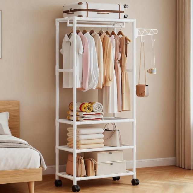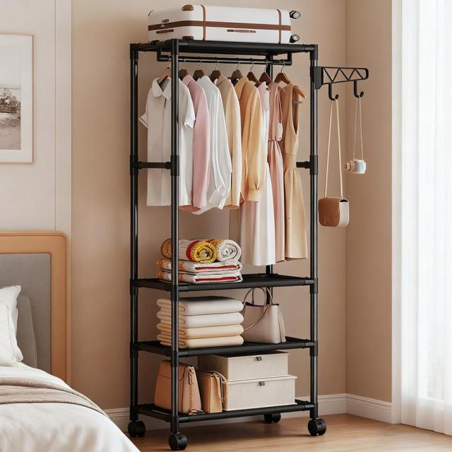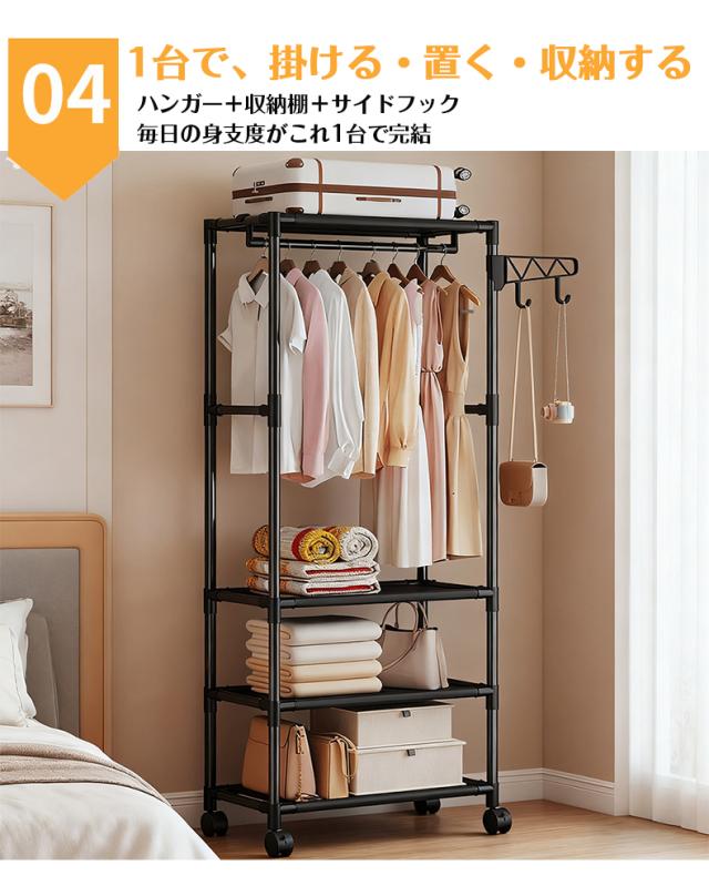 ハンガーラック 多機能 衣類収納ラック 衣類収納ハンガー 収納棚付き キャスター付き 幅55cm サイドフック付 スリム 省スペース収納 クローゼット収納 シンプル 組立簡単 洋服掛け