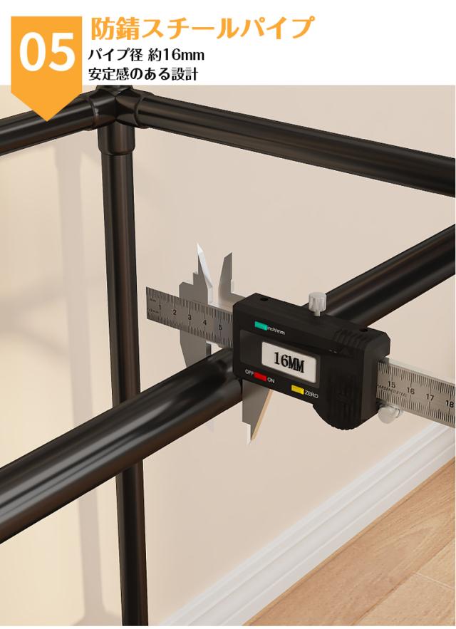 ハンガーポール、収納棚、サイドフックを備えた