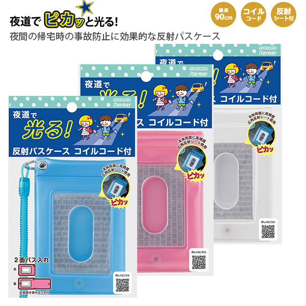 レイメイ藤井 夜道で光る反射パスケース GLP609 -A ブルー / -P ピンク / -W ホワイト リフレクター付 コイルコード付 定期入れ 全面反射 安全 安心 通学 防犯 塾帰り 登下校 小学生 中学生 カードケース 反射板 raymay