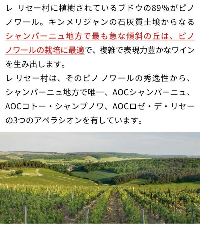 ブルゴーニュにの玄関口との言える南シャンパーニュ、ピノの銘醸地レ リセー村に居を構えるドメーヌ。NM(ネゴシアン マニピュラン)に加え、RM(レコルタン マニピュラン)としてのブランドを展開。こちらは自社畑100%のRMです。標高220mの東向き単一畑と樹齢40年の古樹が、豊かな成熟をもたらします。黄桃やエキゾチックフルーツに、ジャスミンが香る濃密なアロマ。パレットには厚みのある果実味が力強く広がり、立体的な奥行きを形成。張りのある酸と塩味が余韻を心地よく引き締めます。