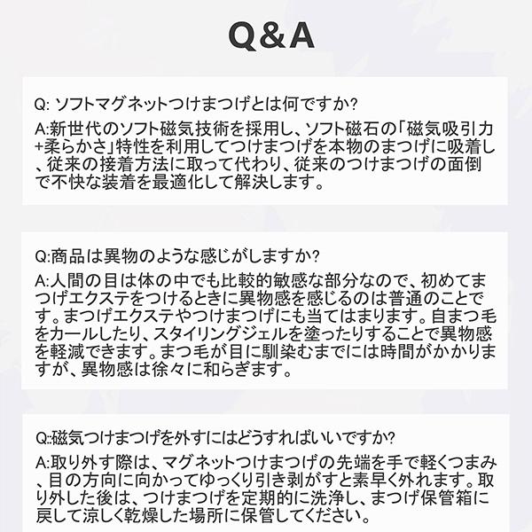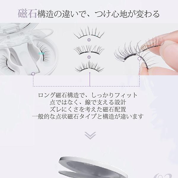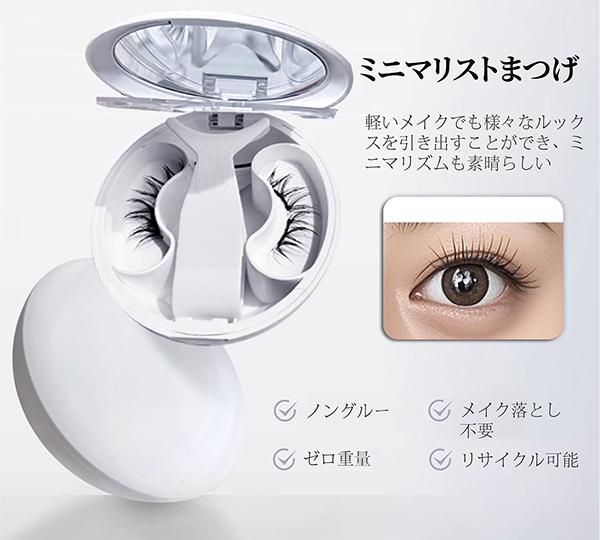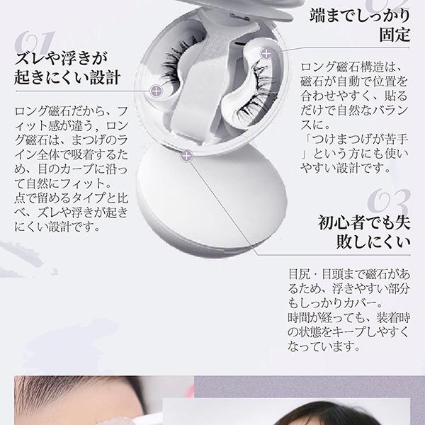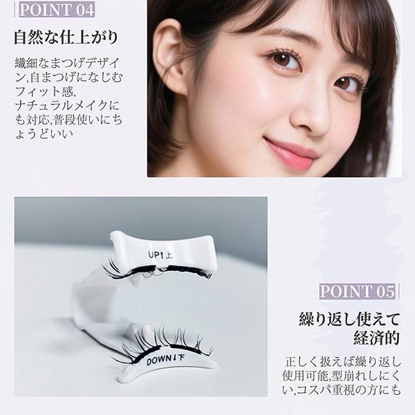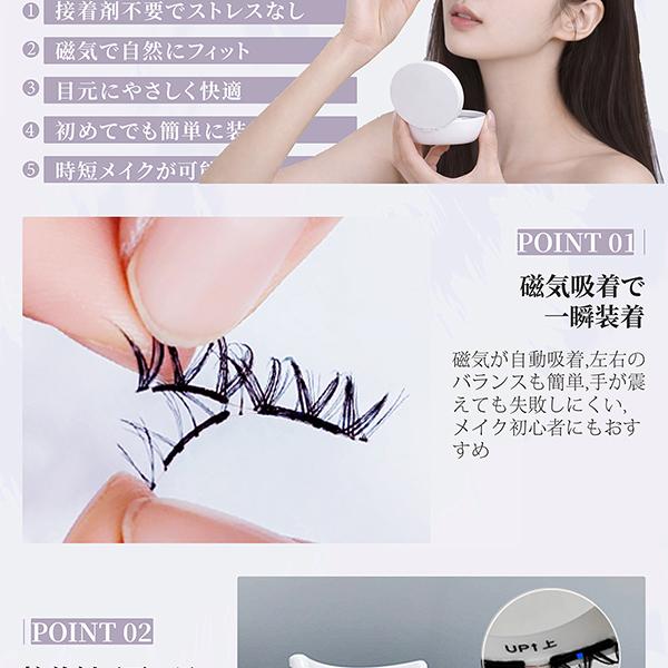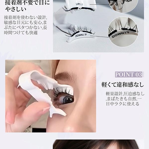 ・【マグネット式・瞬間装着】ヘッドは磁気吸着構造で、近づけるだけでピタッと装着。左右のバランスも取りやすく、手が震えても失敗しにくいため、初心者の方にもおすすめです。・【接着剤不要・目元にやさしい】接着剤を使わない設計で、目がしみにくく敏感な目元にも安心。まぶたにベタつかず、長時間つけても快適なつけ心地です。