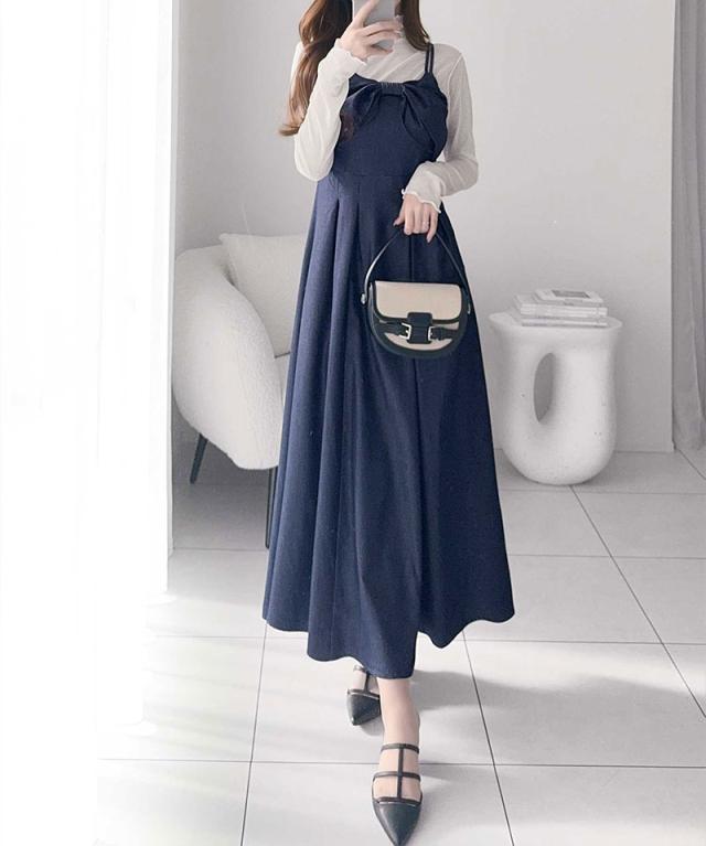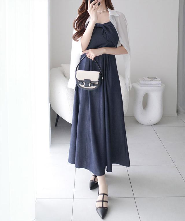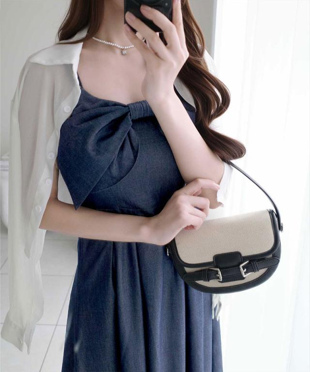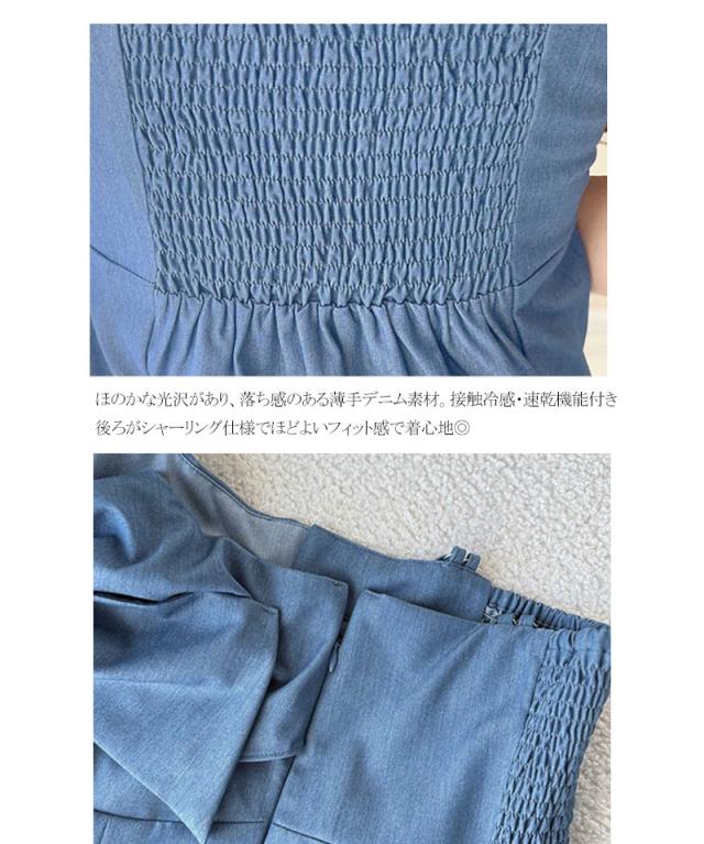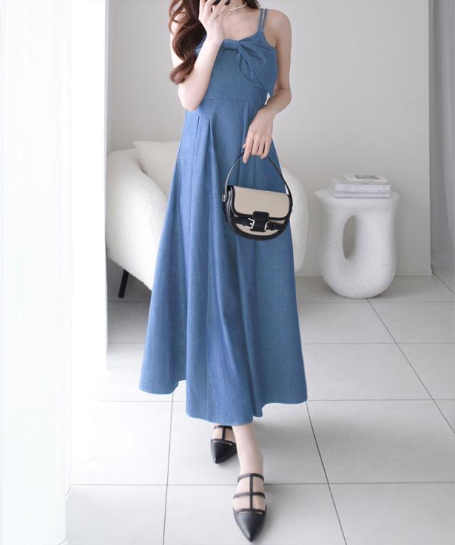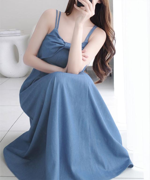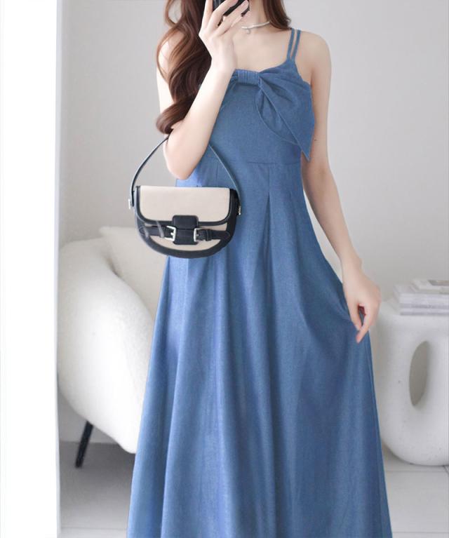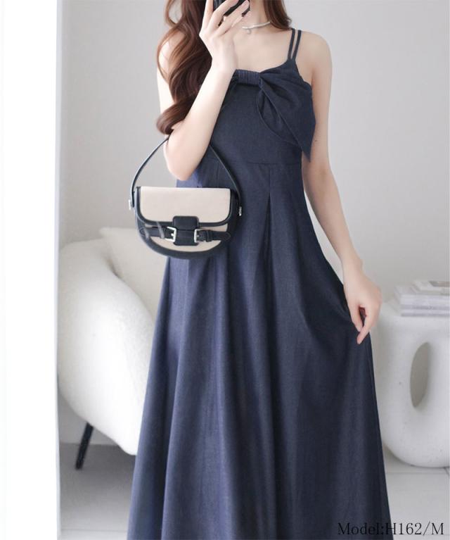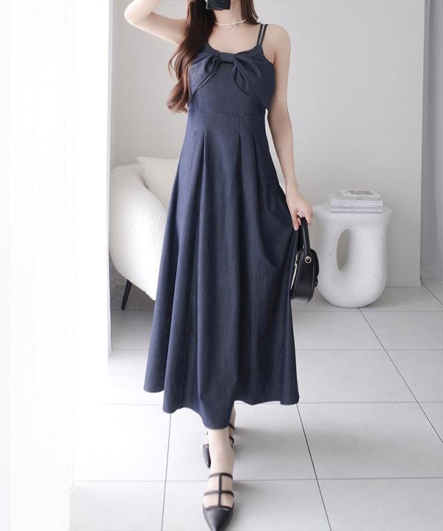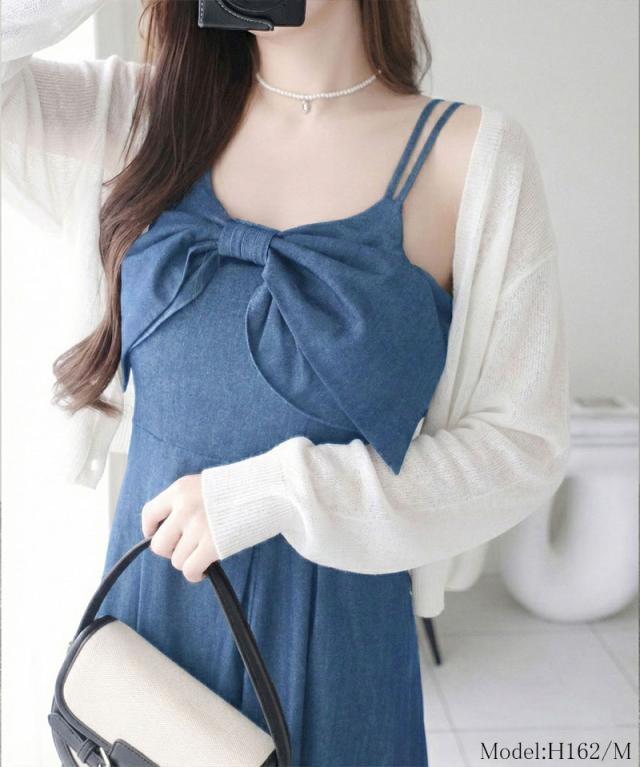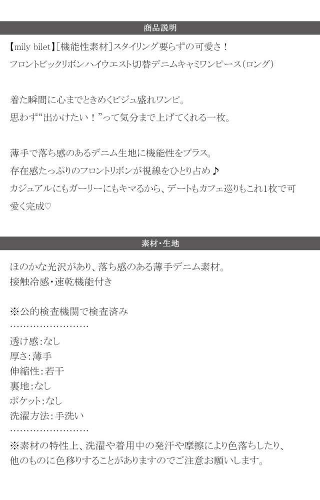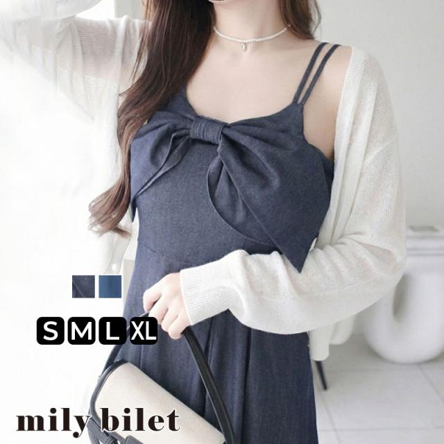 クラシカルエルフ春新作 mily bilet 速乾機能 接触冷感 機能付き ワンピース きれいめ レディース フロント ビック リボン ハイウエスト 切替 デニム キャミワンピ ロング丈 大きいサイズ 2026ss mi1329069