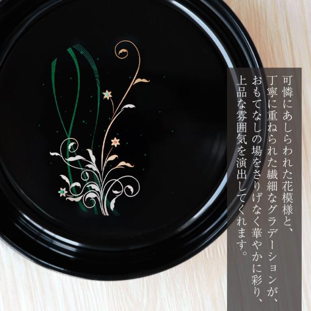 和&モダンをテーマにお洒落で落ち着いた大人のテーブルアイテム。 モダンに咲く華が映える、菓子鉢・茶托(5枚入り)のセットです。 お客様のおもてなしや食卓を上品に演出します。 ご家庭での普段使いだけでなく、御祝いや内祝いなどのギフトや、海外へのお土産にもご好評です。 耐久性にも優れ、お店を営まれている方にもおすすめです。 紀州塗り(紀州漆器)は室町時代の始まりであると伝えられています。 その塗物技法は優れた漆工たちに引き継がれて、昭和53年に通産省より伝統的工芸品の指定を受けております。 美しく、丈夫で使いやすい『ぬりもの』としてご愛用を頂いております。 麗しいぬりものの良さをぜひ、お手に取って味わってみてはいかがでしょうか。 |