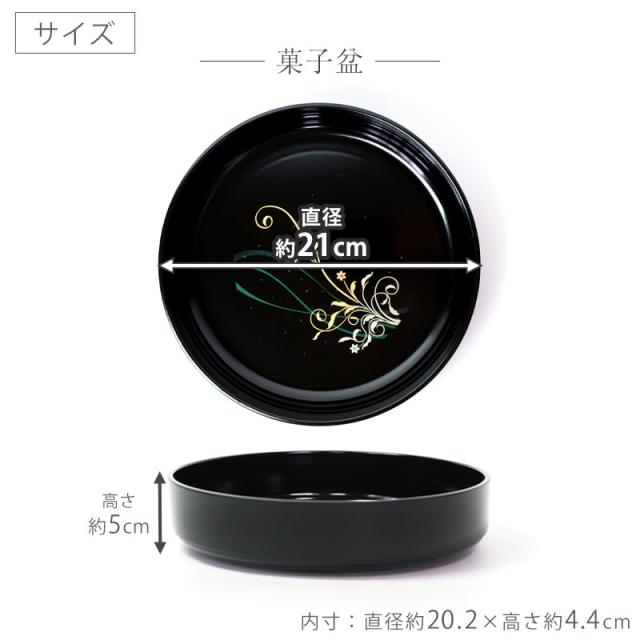 菓子鉢:直径21×高さ5cm(内寸:直径20.2×高さ4.4cm) 茶托(5枚入り):直径12×高さ2cm(内寸:直径10.5×高さ1.8cm) |