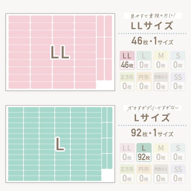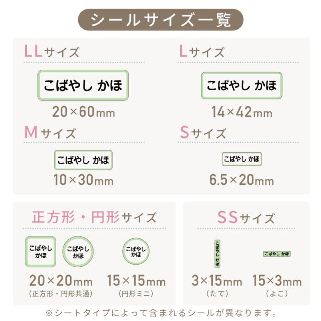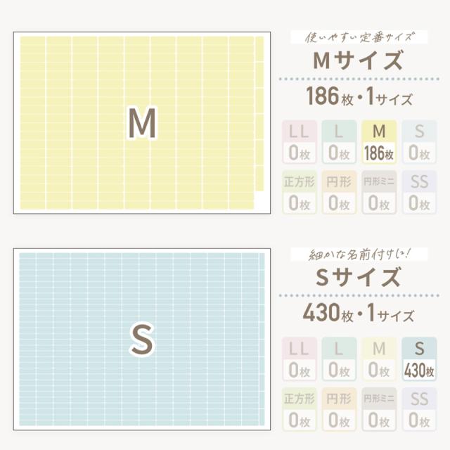| シールサイズ | LLサイズ:縦20mm×横60mm Lサイズ:縦14mm×横42mm Mサイズ:縦10mm×横30mm Sサイズ:縦6.5mm×横20mm 正方形・円形:縦20mm×横20mm 円形ミニ:縦15mm×15mm SS横サイズ:縦15mm×横3mm SS縦サイズ:縦3mm×横15mm ※シートタイプによっては付属しないサイズもあります※ |