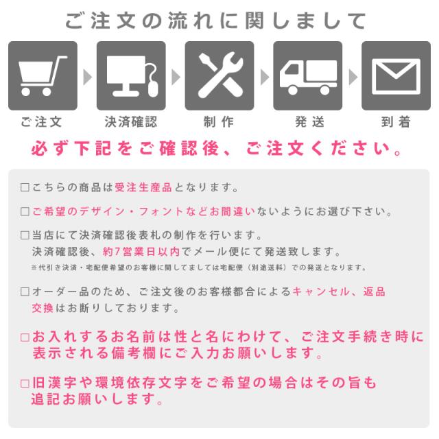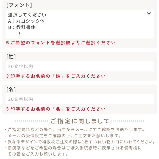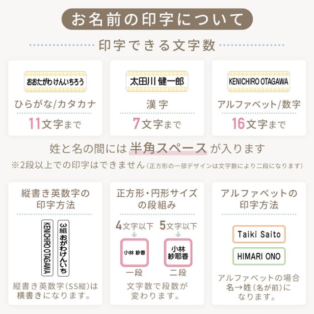 | お名前の印字について | ・性と名の間には半角スペースが入ります。 (ひらがな・カタカナ 11文字まで/漢字 7文字まで/アルファベット・数字・記号 16文字まで) ・SSサイズは縁ではなくお選びいただいたデザインが背景となります。 ・全カラー・全カラーチェックはシールサイズ毎に各カラー均等枚数のセットとなります。 ※シートタイプによっては無地が含まれ、シールサイズの枚数が5枚以下は一部カラーがありません。 ・SS縦サイズで英数字記号は横書き表記となります。 ・細かい漢字はS/SSサイズでは潰れて見える場合があります。 |