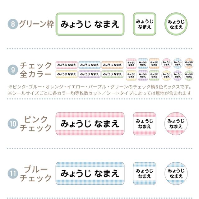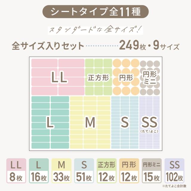 各シールのサイズは全9種類、シートバリエーションは全てのシールサイズが入った全サイズセットや使用頻度の高いサイズのみのセット、入園・入学向きの組み合わせのセットなど全9種類からお選びいただけます。