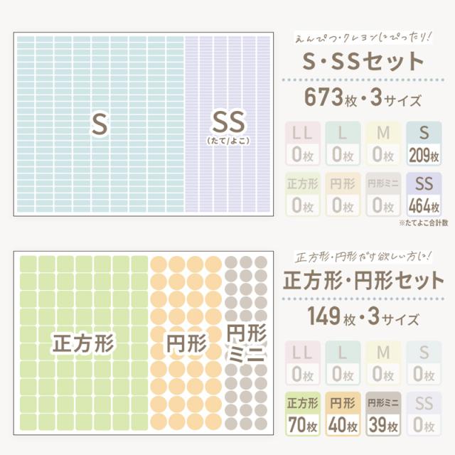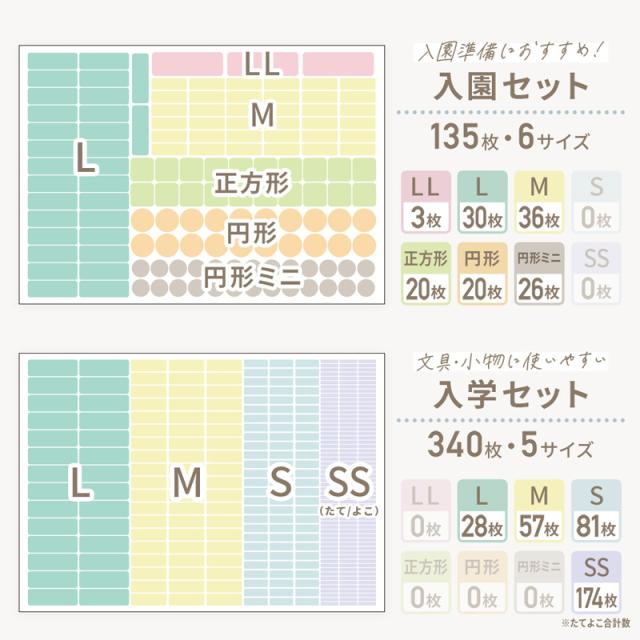 | シートタイプ | スタンダード【全サイズセット】249枚 9サイズ 入園準備に!【入園セット】135枚 6サイズ 文具・小物に使いやすい【入学セット】340枚 5サイズ 文字が見やすい大き目サイズのみ【LL・L・Mセット】66枚 3サイズ 小さめサイズのみ【M・Sセット】275枚 2サイズ えんぴつ・クレヨンなどに【S・SSセット】673枚 3サイズ 正方形・円形だけ【正方形・円形セット】149枚 3サイズ 見やすさ重視【LLサイズ】46枚 1サイズ ちょうど良いサイズ【Lサイズ】92枚 1サイズ 定番サイズ【Mサイズ】186枚 1サイズ 細かな名前つけに【Sサイズ】430枚 1サイズ |