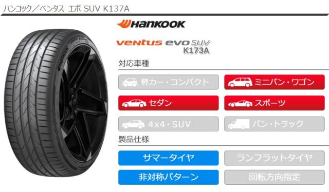 235/55R20 235/55-20 2355520 20インチ sum1227hkk137a VENTUS evo SUV K137A HANKOOK ハンコックタイヤ ヴェンタス エヴォ VENTUSevoSUVK137A 新車装着タイヤ 春タイヤ 夏タイヤ 夏用タイヤ ノーマルタイヤ タイヤ一番 タイヤサイズ 溝 タイヤ交換 タイヤこうかん タイヤくみかえ 組み換え タイヤ取付対象 タイヤ取付可能 タイヤ交換可能 1035194 summertire tiret1p