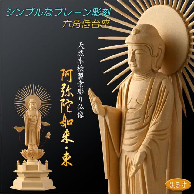 【シンプルなプレーン彫刻 天然木桧製 木彫り仏像 六角低台座 立阿弥陀(お東)3.5寸 真宗の御本尊】仏壇 仏具 手元供養 仏さま 守り本尊 素彫り仏像 コンパクトサイズ 送料無料