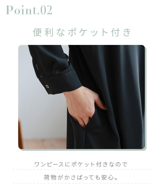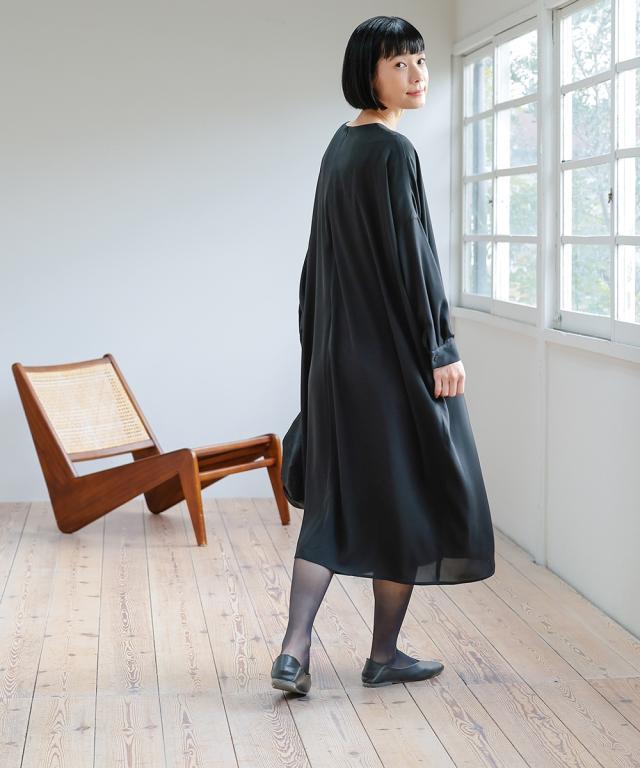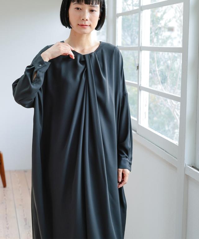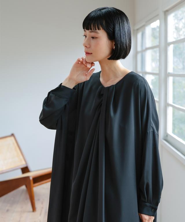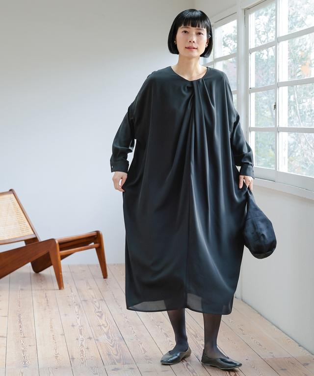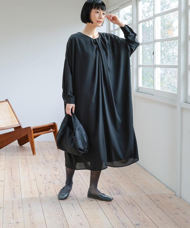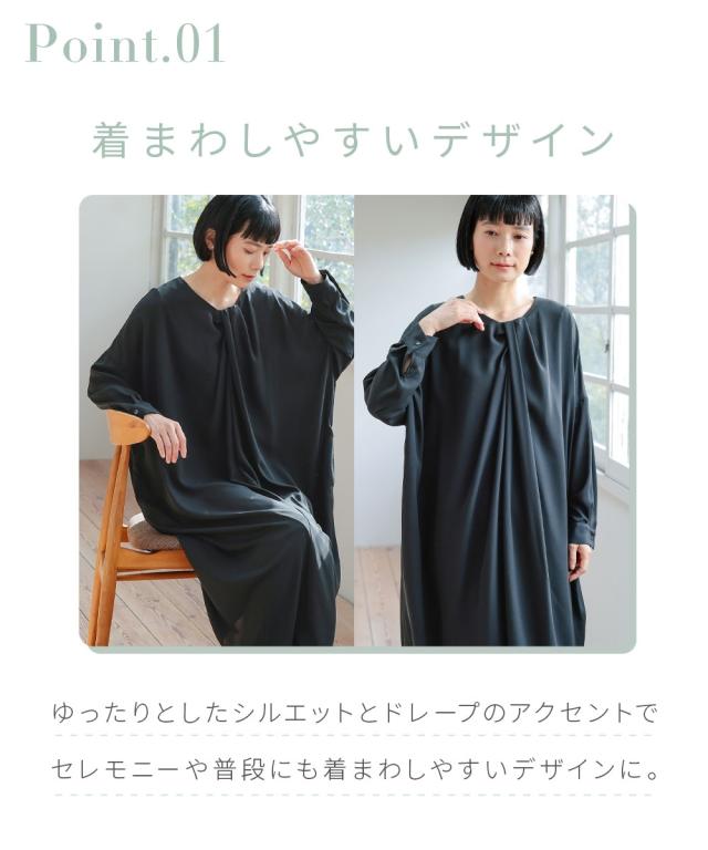 【Neina(ネイナ)】〜for Black Formal〜 『自分らしく丁寧に大切な日を装う。』 大切な日だからこそ、自分らしい装いを持って、丁寧に感謝で送りたい。 <自分らしく丁寧な装いを大切にする方へ> 縛られたカタチではなく、「想い」が人と人をつなぐ。 シーンにもテイストにも年齢にも縛られない自由な着こなしを実現する新しいブラックフォーマル。「品格を纏い、日常まで寄り添う。一着の枠を超えた新しいフォーマル。」 マナーを重んじるブラックフォーマルとしての深い漆黒はそのままに、大切な日が終わってもクローゼットに眠らせない、高い汎用性を備えた一着。 上質な日本製生地が叶える気品ある佇まいは、冠婚葬祭だけでなく、人生のさまざまな節目を優しく彩ります。 肩幅や身幅をゆったりさせたリラックス仕様の「コクーンシルエット」が、フォーマルの緊張感を「こなれ感」へと昇華。 お手持ちのパールのネックレスを合わせれば凛とした弔事の装いに。コサージュや華やかな小物を添えればハレの日の装いに。 一過性のイベントで終わらない、あなたの毎日にしなやかに溶け込む、新しい時代のブラックワンピースです。■ おすすめポイント ・ゆったりリラックス仕様:肩幅・身幅にゆとり