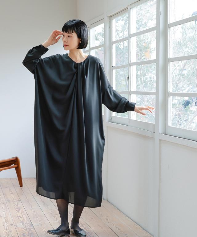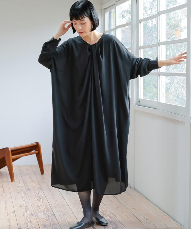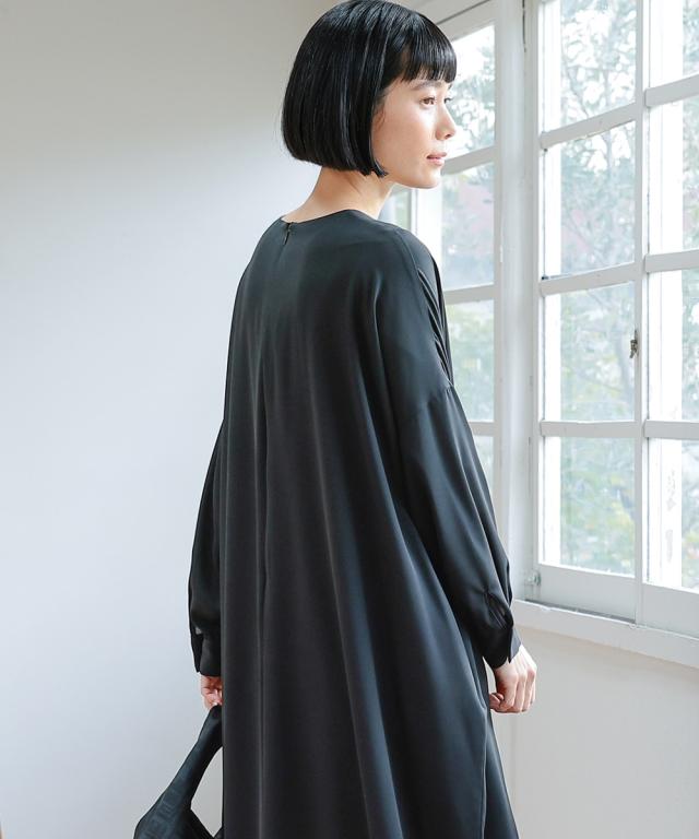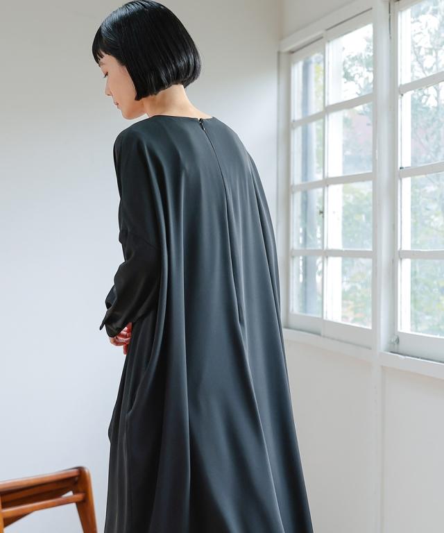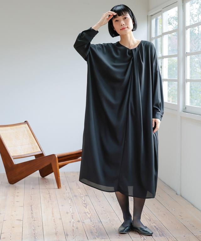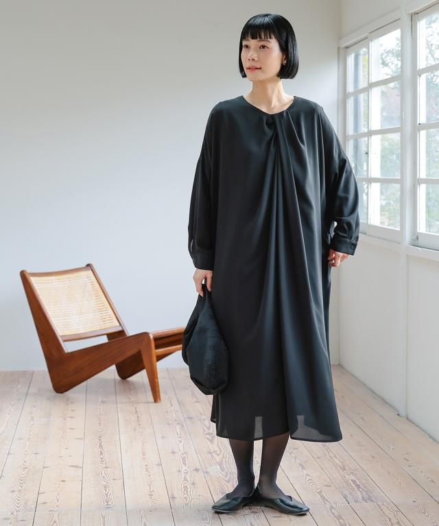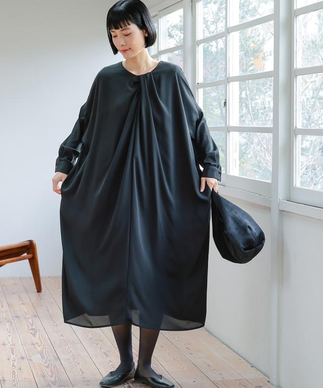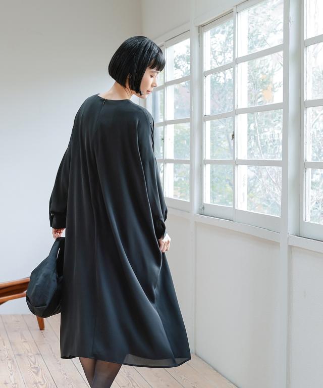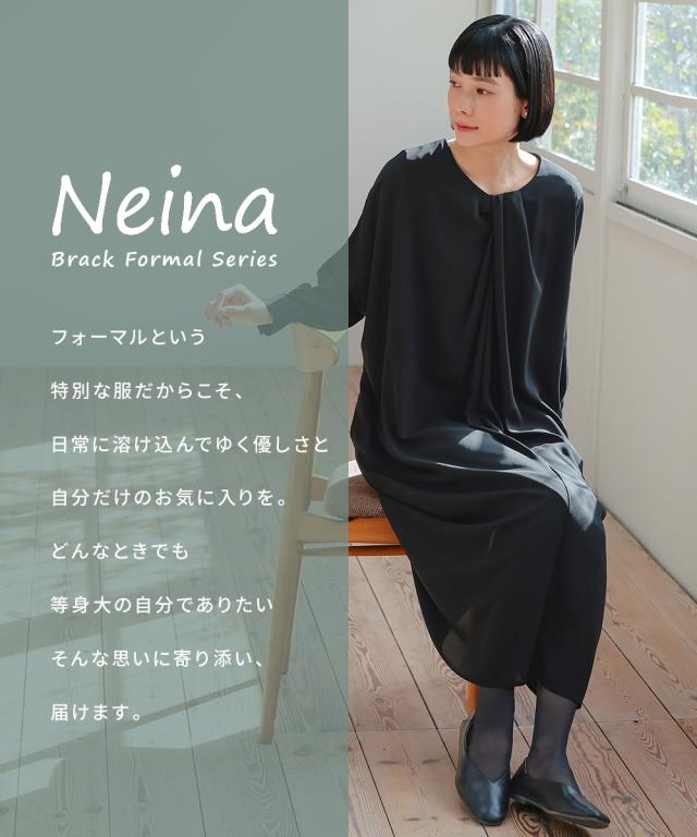 【Neina(ネイナ)】〜for Black Formal〜 『自分らしく丁寧に大切な日を装う。』 大切な日だからこそ、自分らしい装いを持って、丁寧に感謝で送りたい。 <自分らしく丁寧な装いを大切にする方へ> 縛られたカタチではなく、「想い」が人と人をつなぐ。 シーンにもテイストにも年齢にも縛られない自由な着こなしを実現する新しいブラックフォーマル。「品格を纏い、日常まで寄り添う。一着の枠を超えた新しいフォーマル。」 マナーを重んじるブラックフォーマルとしての深い漆黒はそのままに、大切な日が終わってもクローゼットに眠らせない、高い汎用性を備えた一着。 上質な日本製生地が叶える気品ある佇まいは、冠婚葬祭だけでなく、人生のさまざまな節目を優しく彩ります。 肩幅や身幅をゆったりさせたリラックス仕様の「コクーンシルエット」が、フォーマルの緊張感を「こなれ感」へと昇華。 お手持ちのパールのネックレスを合わせれば凛とした弔事の装いに。コサージュや華やかな小物を添えればハレの日の装いに。 一過性のイベントで終わらない、あなたの毎日にしなやかに溶け込む、新しい時代のブラックワンピースです。■ おすすめポイント ・ゆったりリラックス仕様:肩幅・身幅にゆとり