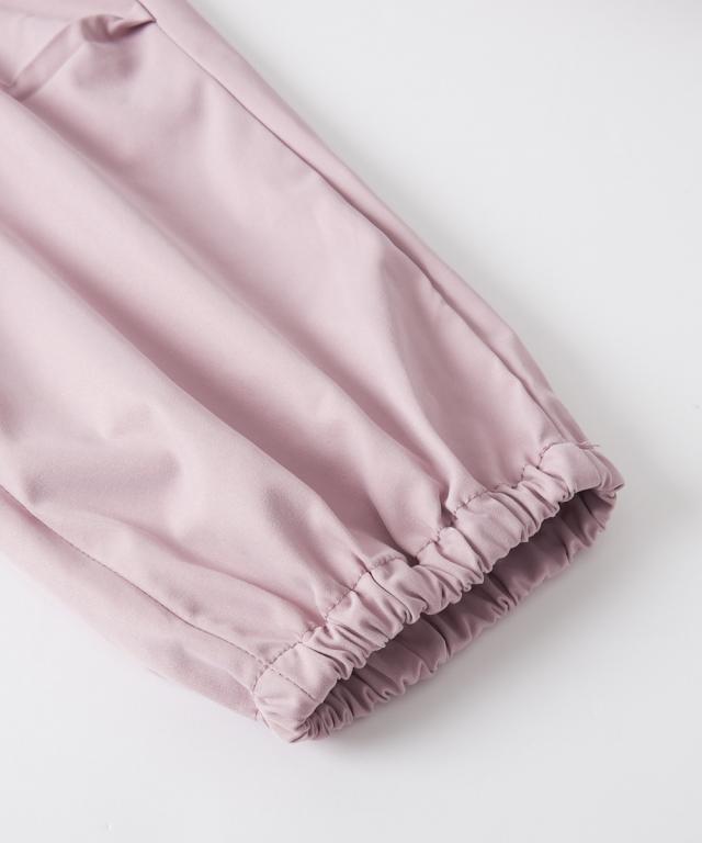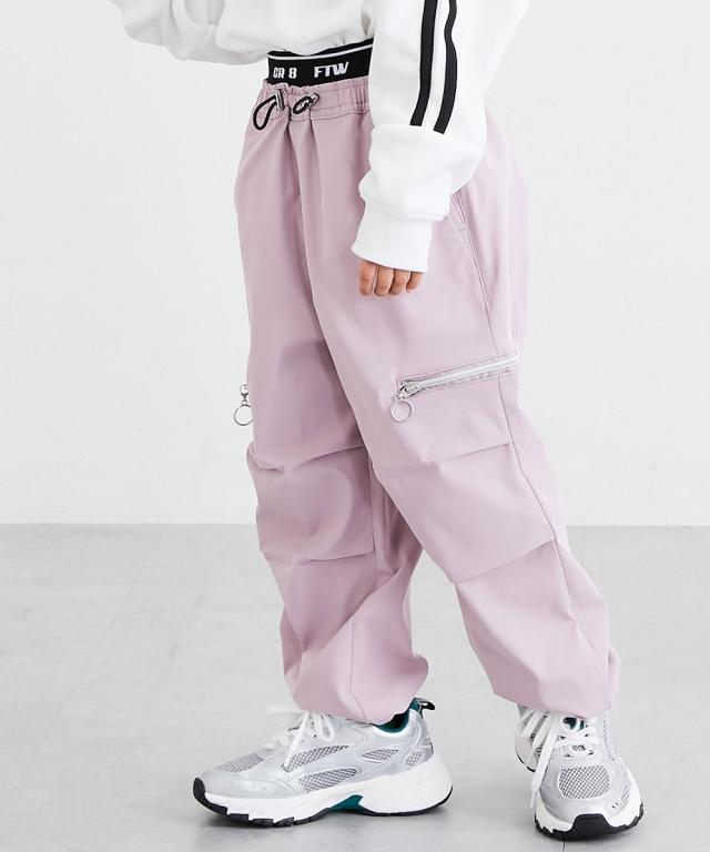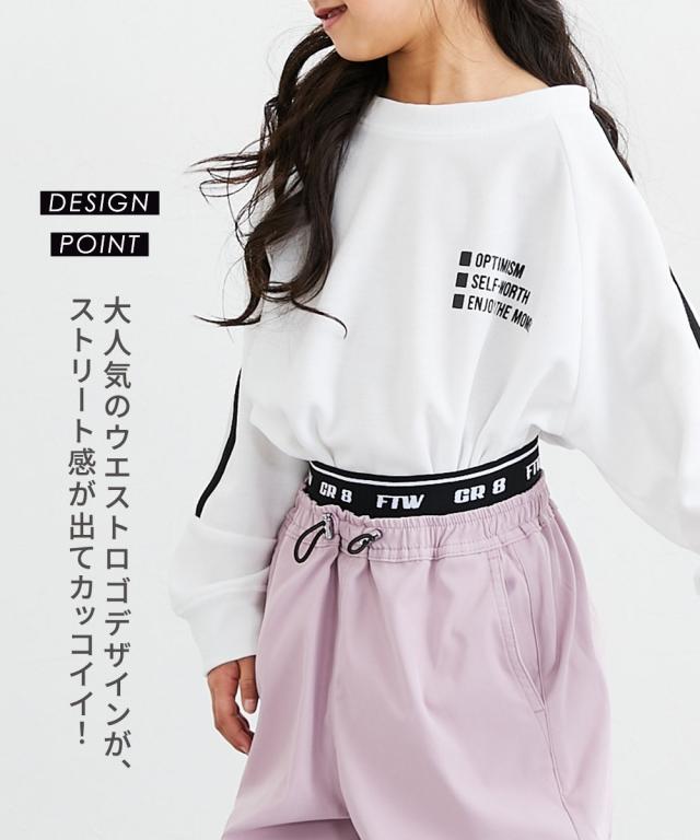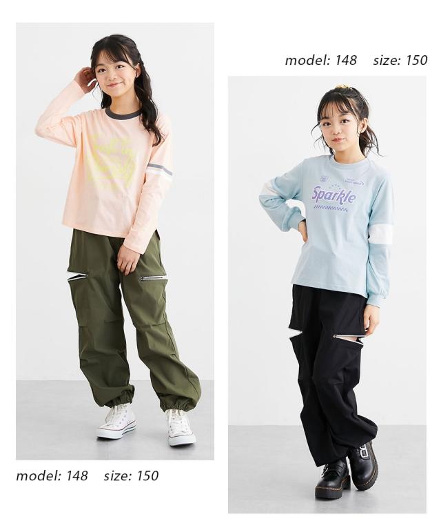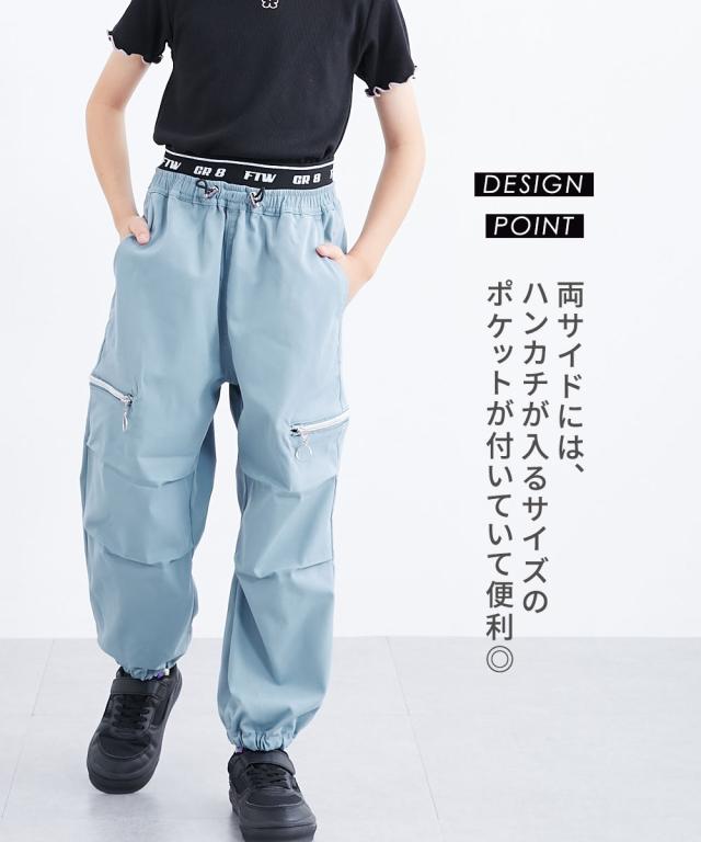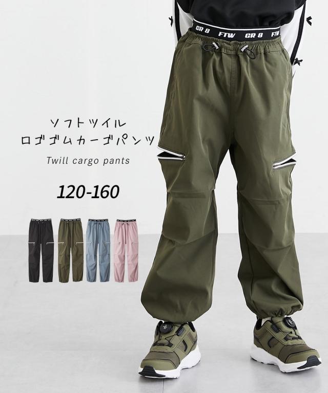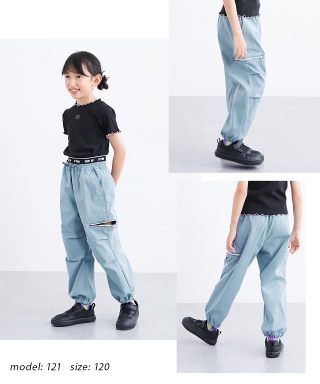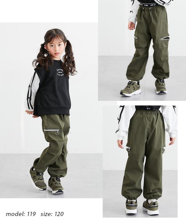 ウエストのロゴ入りゴムがアクセントになった、トレンド感たっぷりのカーゴパンツです。 大人っぽいブラックやカーキに加えて、可愛らしいラベンダーやブルーグレーも揃った4色展開。 120センチから160センチまでサイズも幅広く、お姉さんらしいクールな着こなしが簡単に決まります。 柔らかいソフトツイル素材で履き心地もよく、ダンスや学校、お出かけなど、どんなシーンでもおしゃれに履きこなせる一着です。 ■デザイン ・ウエスト部分には、スタイリッシュなロゴ入りの幅広ゴムを採用しました。トップスをインしたときにチラリと見えるロゴが、コーディネートをグッと引き締めて、今どきなストリート感を演出してくれます。 ・太もものサイドには、シルバーのリング引き手がおしゃれなジップスリットをあしらいました。ジップを開けるとスリットになり、さりげない肌見せや動きやすさをプラス。その日の気分やスタイルに合わせて、自分らしい着こなしを楽しめます。 ・ウエストの中央には、ストッパー付きのドローコードが付いています。お子様の体型に合わせて細かくサイズを調整できるので、元気に動いてもズレにくく、ずっと快適なフィット感で過ごせます。 ・裾がキュッと絞られた形になって