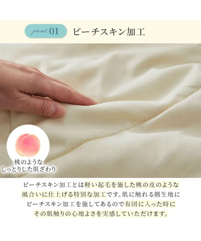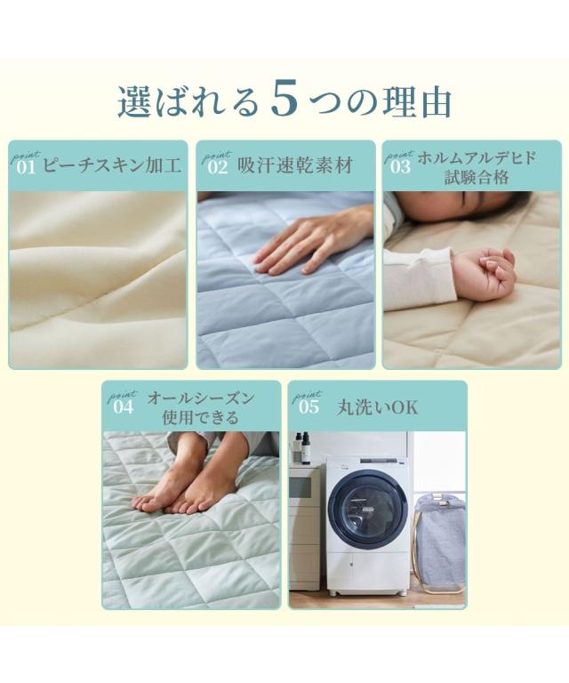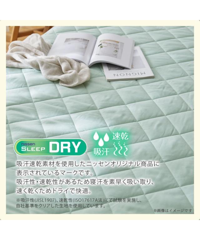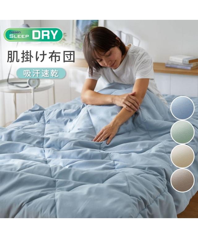 夏の寝苦しさを、サラふわの心地よさに変える一枚 「夜中に暑くて目が覚めてしまう」「汗で布団が肌に張り付くのが不快」そんな夏の眠りの悩みを解決するために生まれたのが、この吸汗速乾肌掛け布団です。 室温や湿度が高い夜、私たちの体は汗をかくことで体温を調節しようとします。 しかし、寝具の通気性が悪いと湿気が逃げ場を失い、布団の中に熱がこもって「寝苦しさ」の原因に。 そこで本製品は、吸汗速乾素材を採用し、かいた汗や湿気を素早く吸収して外へ逃がすため、ベタつきを抑え、サラサラとしたさわやかな寝心地をキープします。 さらに、薄い起毛を立てることで、まるで桃の皮のような、しっとりとなめらかな質感を実現。 吸汗速乾の機能性に加え、布団に入った瞬間に包み込まれるような心地よさを実感いただけます。 ●種類 【肌掛け布団】 肌掛け布団は、キルティング加工が施された薄手の掛け布団です。 生地の間には中綿が入っており、肌掛け布団よりも軽く、タオルケットよりも厚みのある寝具です。 春〜夏にかけてだけでなく、他の掛け布団と組み合わせれば一年中使用できるのが特徴です。 ●ブランド・シリーズ 【nissen SLEEP DRY】スリープドライって 吸汗速乾生地を使用