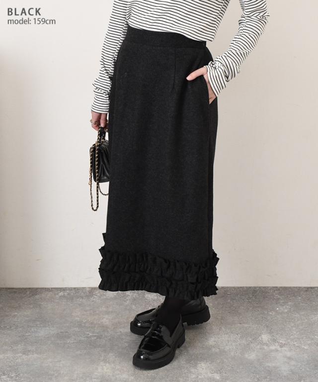 新作 スカート ウールライク 裾フリル 秋 冬 厚手 ロング ミモレ ウエストゴム ボトムス オフィス きれいめ 膝下 Aライン 暖かい 通勤 通学