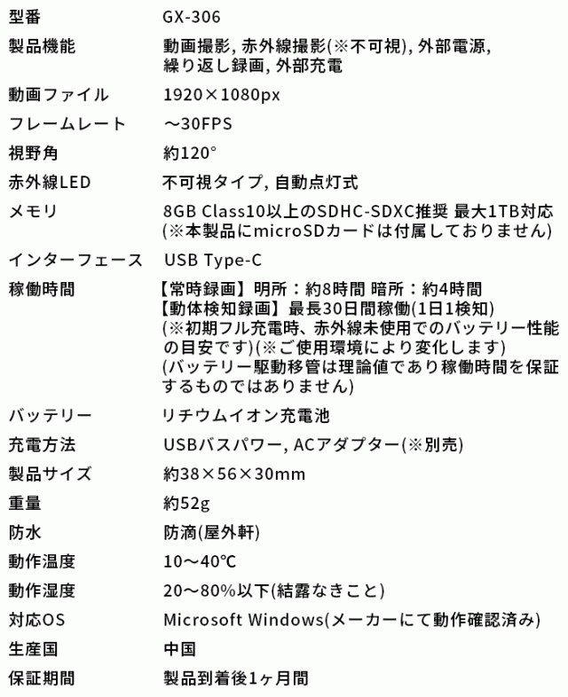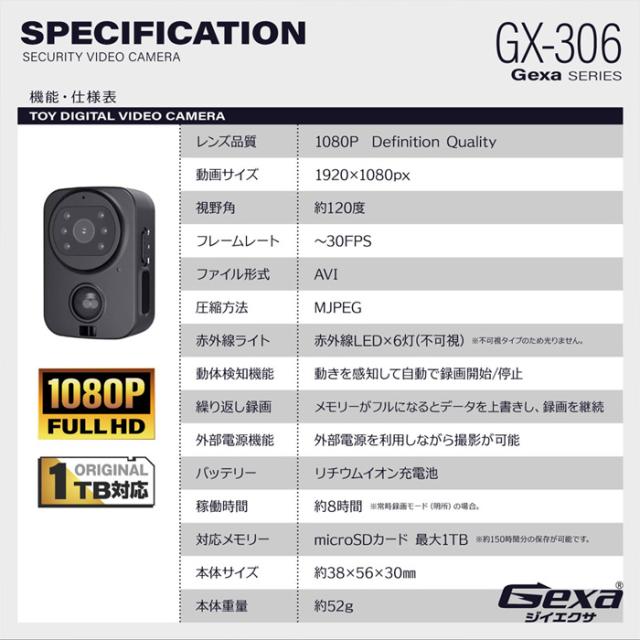 ■ GX-306 | フルHD録画対応広角120°ワイドレンズ搭載小型防犯カメラ