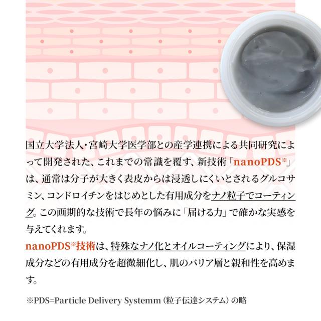 国立大学法人・宮崎大学医学部との産学連携による共同研究によって開発された、これまでの常識を覆す新技術「nanoPDS※」は、通常は分子が大きく表皮からは浸透しにくいとされるグルコサミン、コンドロイチンをはじめとした有用成分をナノ粒子でコーティング。この画期的な技術で長年の悩みに「届ける力」で確かな実感を与えてくれます。