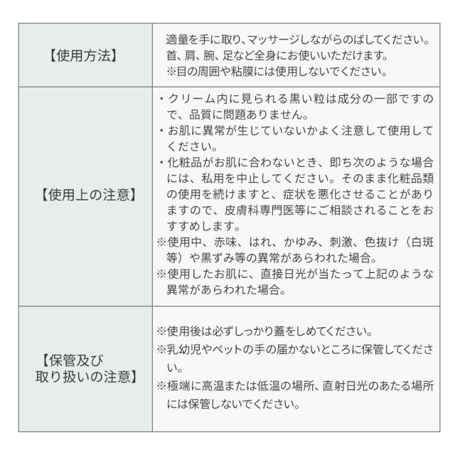 ・クリーム内に見られる黒い粒は成分の一部ですので、品質に問題ありません。