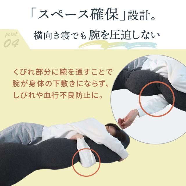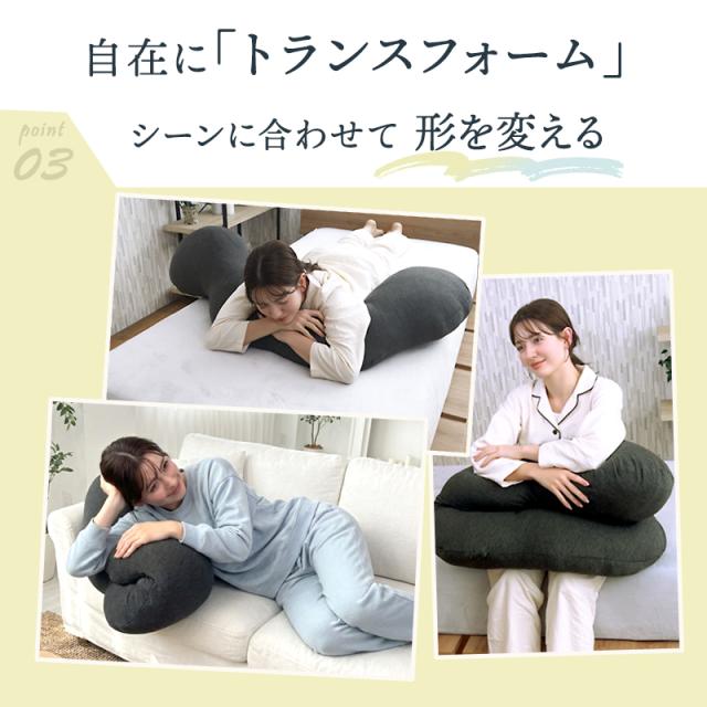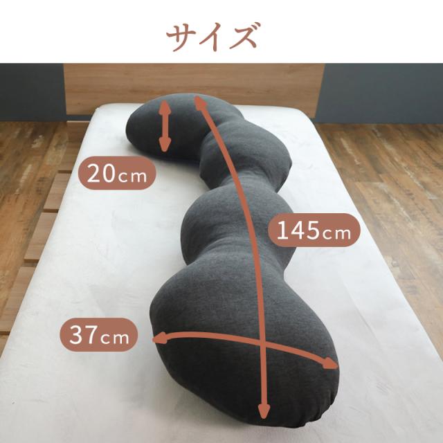 ■多節型でくびれにフィット 独自の多節構造で、計算された4つのセクションが身体のラインに合わせて自由自在にフィットします。 ■手足がすっぽり収まる、理想の抱き心地 節のカーブに腕や脚が心地よく固定されるため、体圧を分散しながら安定した姿勢をキープできます。 ■自在にトランスフォーム 就寝時の抱き枕としてはもちろん、読書時の背もたれや足枕など、用途に合わせてカタチを変えられます。 ■産前産後のママをサポート 妊婦さんの理想的な寝姿勢「シムス位」をサポートし、お腹や腰への負担を軽減。産後は授乳クッションとしても活躍します。 | ||
