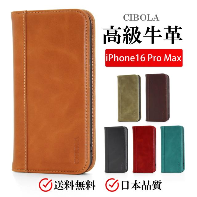 日本メーカーCIBOLA発売の高級牛革・本革 iPhone 16 Pro Max 手帳型スマホケース。耐衝撃、スタンド機能、カード収納で便利、本革のエイジングが楽しめる逸品。