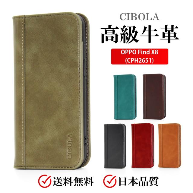 日本メーカーCIBOLA発売の高級牛革・本革 OPPO Find X8 ( CPH2651 ) 手帳型スマホケース。耐衝撃、スタンド機能、カード収納で便利、本革のエイジングが楽しめる逸品。