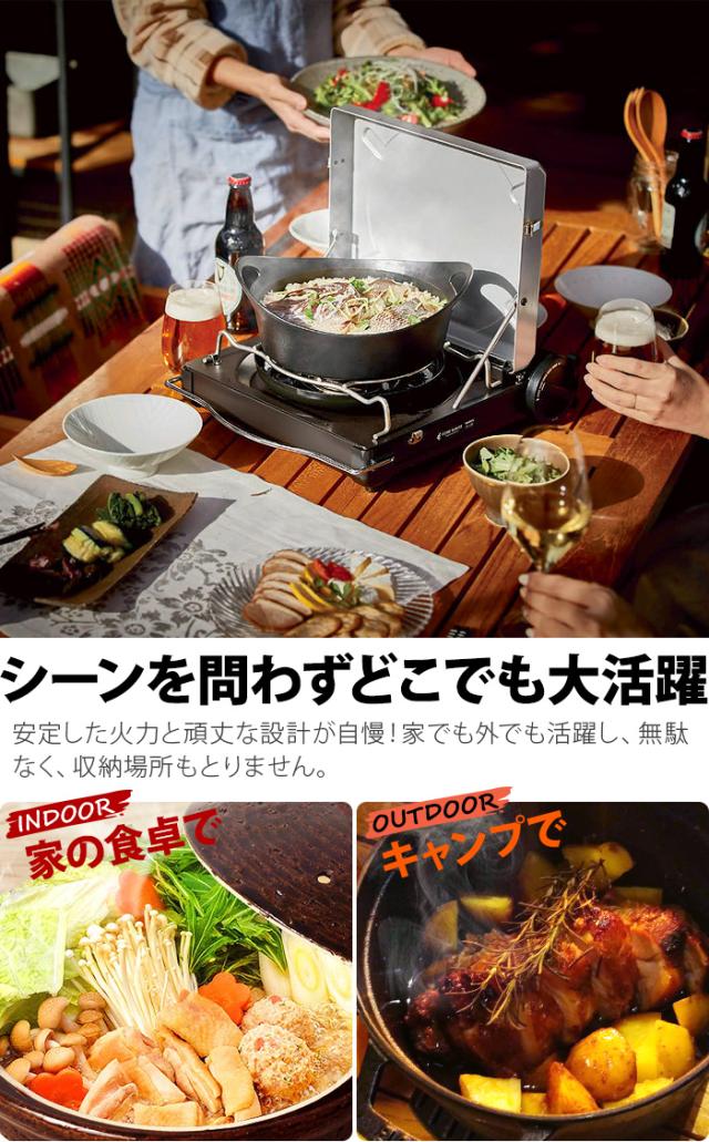キャンプやBBQで炭や焚火の火おこしが苦手な方でも、身近なカセットガスを使用して手軽にアウトドアクッキングを楽しめます。また、雨キャンプで炭や焚火が使えない時、キャンプ撤収日の朝にも、タープの下で火の粉が飛ぶ心配をせず、時短&安全に火を使った調理ができるのもうれしいポイント!