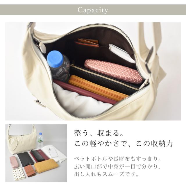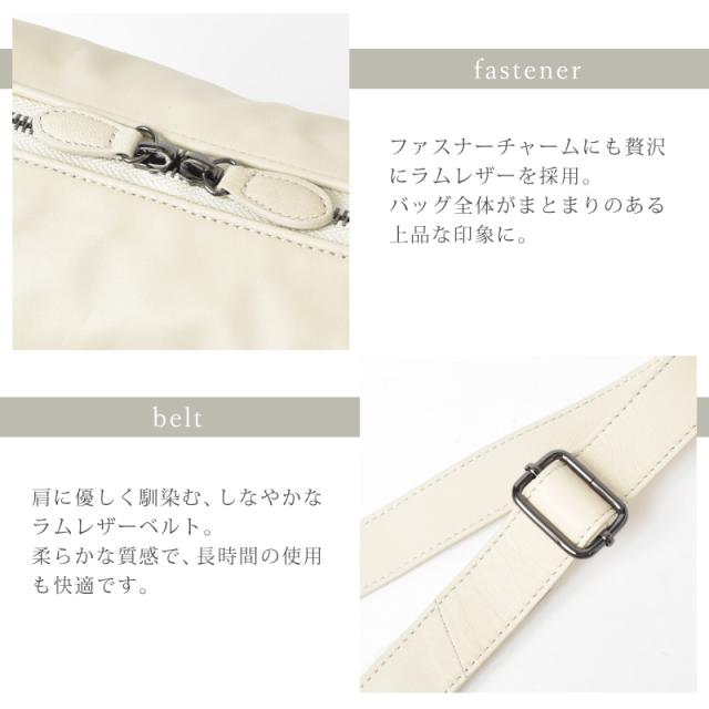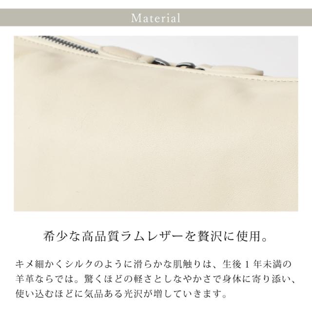 希少な高品質ラムレザーを贅沢に使用。 キメ細かくシルクのように滑らかな肌触りは、生後1年未満の羊革ならでは。 驚くほどの軽さとしなやかさで身体に寄り添い、使い込むほどに気品ある光沢が増していきます。 この軽やかさで、この収納力 ペットボトルや長財布もすっきり収納。広い開口部で中身が一目で分かり、出し入れもスムーズです。 ポケット(内側) バッグの内側にはファスナーポケットが1ヵ所。 スマホや貴重品など、大切な小物の収納に便利です。 反対側にはフリーポケットが2ヵ所。こちらもスマホや鍵、リップなどの、すぐに使いたい物をスッキリ収納できます。 ポケット(外側) バッグ外側には、マグネットボタンで開閉できるポケットが1ヵ所。スマホや、パスケースなどの収納に便利です。 裏側にはファスナーポケットが1ヵ所。すぐに使いたいパスケースやハンカチなどの収納に便利。ファスナー付きで安心です。 ファスナーチャームにも贅沢にラムレザーを採用。バッグ全体がまとまりのある上品な印象に。 肩に優しく馴染む、しなやかなラムレザーベルト。柔らかな質感で、長時間の使用も快適です。 男女兼用で使えるシンプルながらも洗練されたデザインです。 【ラッピングサービス】 別途プラス200円でラッピングサービスを承ります。 ラッピング【希望する】をご選択ください。 |