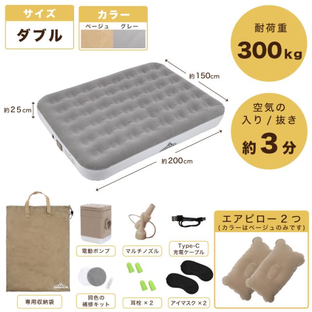 電動エアーベッド ダブル D 厚み25cm 電動エアーマットレス 電動ポンプ内蔵 収納袋付き エアピロー付き 来客用 防災用品 キャンプ アウトドア 簡易ベッド 予備ベッド 空気 折り畳み収納