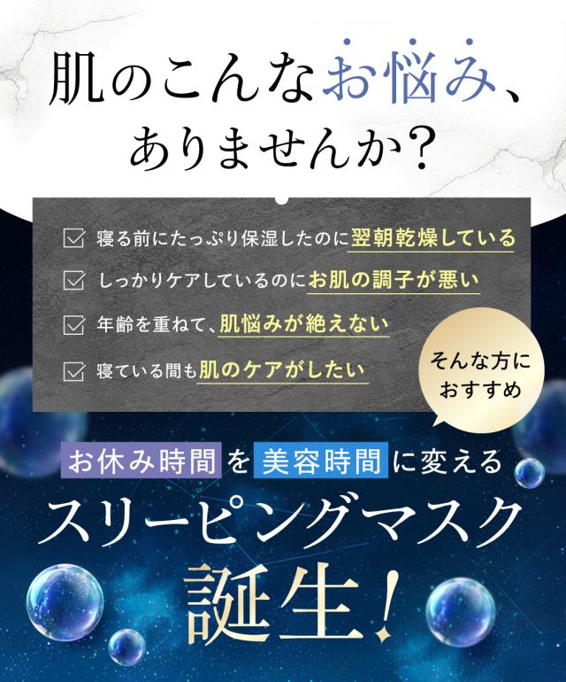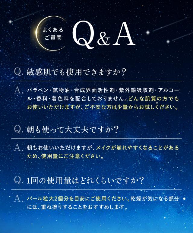 | 使い方 | 適量を手に取り、お顔全体にやさしくのばしてください。乾燥が気になる部分には特にたっぷりとなじませてください。しばらくするとジェルがお肌になじんできますので、洗い流さずそのままおやすみいただけます。 |