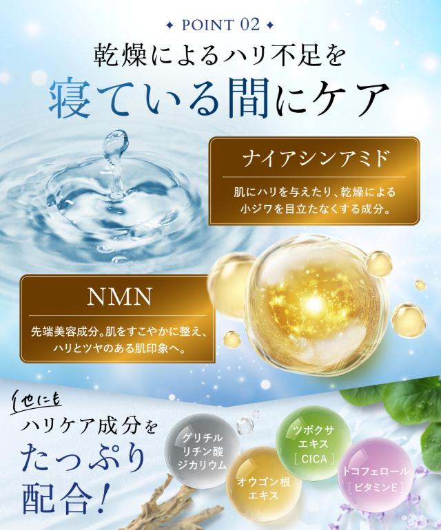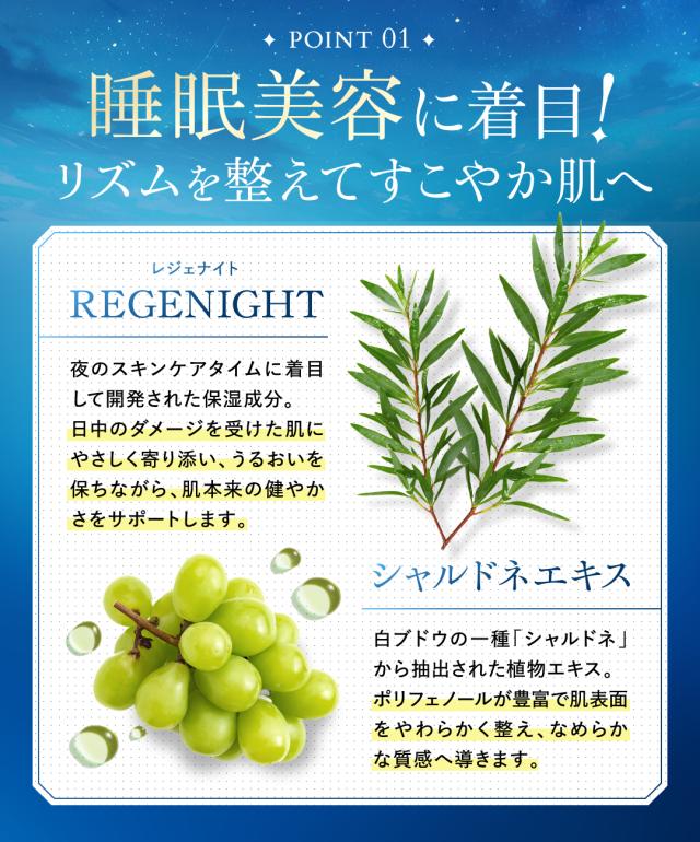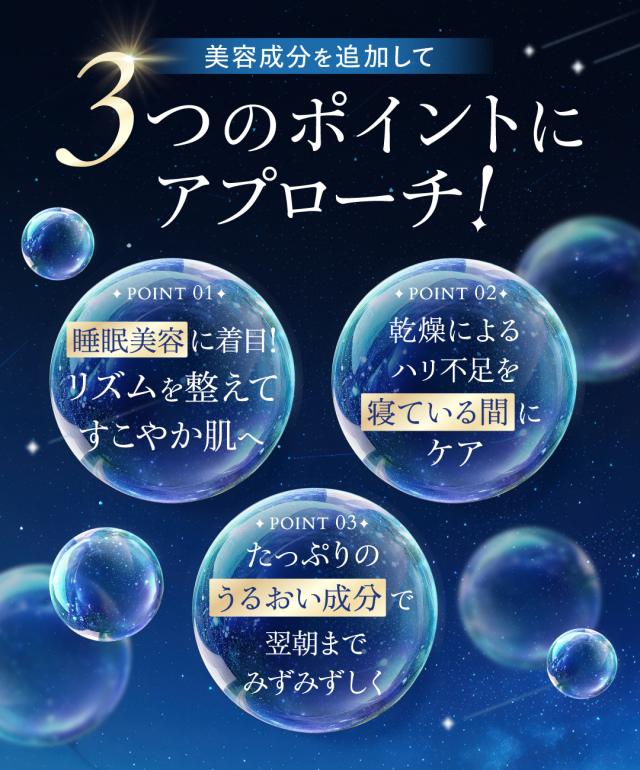 夜のスキンケアに取り入れるだけで、翌朝たっぷり寝たようなツヤ肌に導く夜用のナイトクリームです。美白のカギとなるラメラ構造に似ている天然の青色成分を配合。この成分が角質の隙間に入り込み、肌のバリア機能を高めながら、うるおいで肌を満たし、なめらかな印象へと導きます。睡眠美容に着目した肌のリズムを整える成分やナイアシンアミド、近年話題のNMNを配合。さらに4種のヒアルロン酸やユズセラミド を配合しているので翌朝までみずみずしいお肌を保ちます。