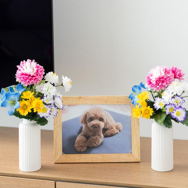 フラワーデザイナーがアレンジしたお墓・仏壇用のお供え花2束組。 造花だから水やり要らずで、お手入れ不要! 枯れる心配もなく、美しい色合いを長期間保てます。 小さめの花器にも丁度良い小ぶりなサイズ。 ペットへのお供えや、コンパクトな仏壇にもピッタリ。 ワイヤー入りでお好みの形にアレンジも可能です。 【お手入れ方法】 汚れが付いた場合はよく絞った布で水拭きしてください。 ※シンナー・ベンジン等は使用しないでください。 ■商品サイズ(約):20cm [花部]14cm、[茎部]6cm、[ヨコ]18cm ※1束あたりのアレンジ全体でのサイズ ■素材:[花・葉]ポリエステル、[茎]EVA樹脂、[ワイヤー]スチール ■原産国:中国 【使用上の注意】 ●用途以外には使用しないでください。 ●花受けから茎を3分の1以上出さないでください。転倒の恐れがあります。 ●花受けがゆるいときは過度な高さ調節を控えてください。花を少し広げて飾ると安定しやすくなります。 ●茎にワイヤーが入ってますので水に濡れると錆びます。花瓶や花筒に水を入れて使用しないでください。 ●屋外で使用する場合は雨水などで錆びますのでご注意ください。 ●濡れた状態で強い摩擦を受けたりすると、他のものに色移りする恐れがあります。 ●ロウソクや線香などの火気に近づけたり高温の場所に放置したりすると、変形する恐れがありますので取り扱いにご注意ください。 ●長期間、直射日光に当たると色落ち等、商品劣化の原因となります。 ●子供の手の届くところに置かないでください。 ●廃棄の際は各自治体の処理方法に従ってください。 【2602r】 |