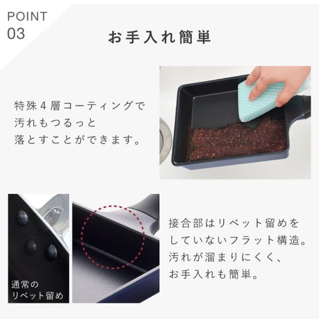軽量・耐久性・こびりつきにくい。毎日の調理をもっと軽やかに、快適にする玉子焼きパン。毎日のお弁当作りや朝食に活躍する、シリーズ専用の玉子焼きパン。手早く、きれいに仕上げたい玉子焼きにぴったりの一枚です。