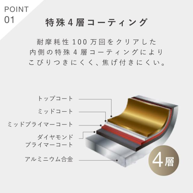 耐摩耗性100万回をクリアした独自の特殊コーティングを内面に施し、こびりつきにくさを実現。焦げ付きやすいソースやタレも弾くように調理できます。食材がスムーズに返せるので、調理中のストレスも軽減します。