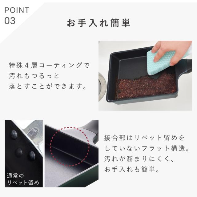 軽量・耐久性・こびりつきにくい。毎日の調理をもっと軽やかに、快適にする玉子焼きパン。毎日のお弁当作りや朝食に活躍する、シリーズ専用の玉子焼きパン。手早く、きれいに仕上げたい玉子焼きにぴったりの一枚です。