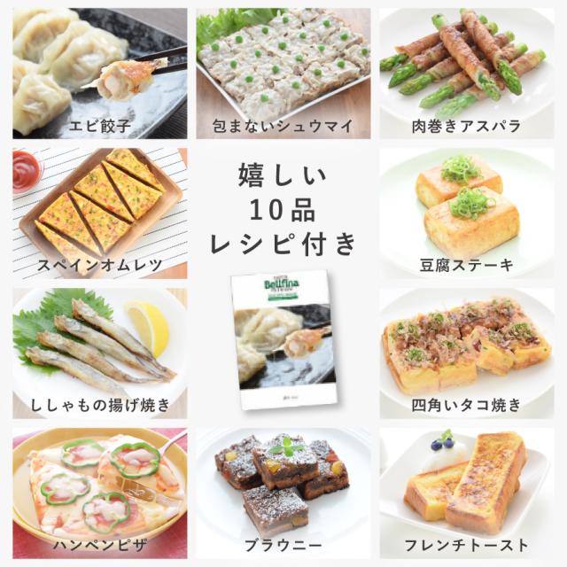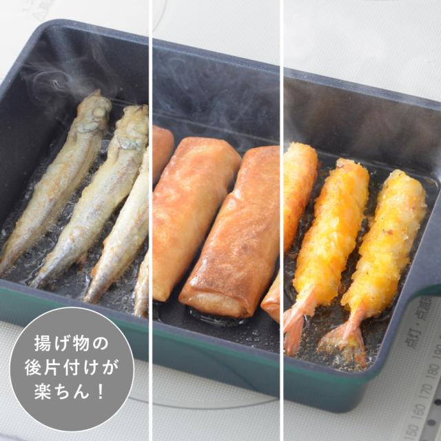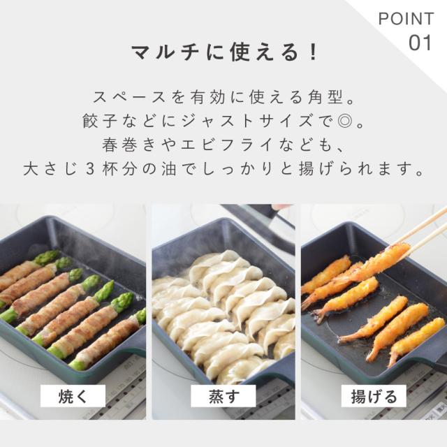 焼き餃子、揚げ焼き唐揚げ、蒸し野菜、焼き魚など多彩なメニューに対応。ジャストサイズだから、大さじ3杯程度の油で揚げ焼きができ、後片付けもぐっとラクになります。付属の10品レシピで毎日の献立にも困りません。