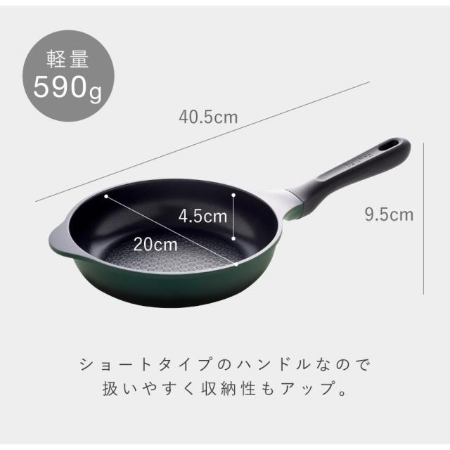 軽量・耐久性・こびりつきにくい。毎日の調理をもっと軽やかに、快適にする20cmフライパン。朝食やお弁当作り、少量の炒め物などにちょうどよく、さっと使えて出番の多いフライパンです。扱いやすいサイズ感で、忙しい日常の調理をスムーズにサポートします。