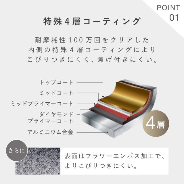また、フラワーエンボス加工が食材との接触面積を減らすので、さらにこびりつきを抑え、食材がスムーズに返せるので、調理中のストレスも軽減します。