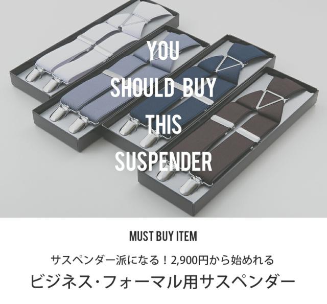 | ※サスペンダー使用上のご注意 サスペンダーの品質には十分に注意を払っておりますが、使用上以下の点にご注意ください。 *本革を使用しているため色移りする場合がございますので、汗や水濡れにご注意ください。 *サスペンダーのクリップはベルト通し(ベルトループ)の部分を避けて装着してください。 *サスペンダーのクリップは、ベルトの上からはさまないでください。 *サスペンダーのクリップのふたが閉まりにくいほど厚い生地、または厚い部分をはさまないでください。 *サスペンダーを装着する際は、ズボンを吊り上げる以上の力がかかる状態でのご使用は避けてください。 |