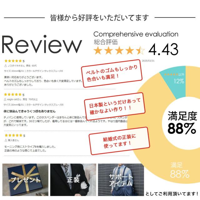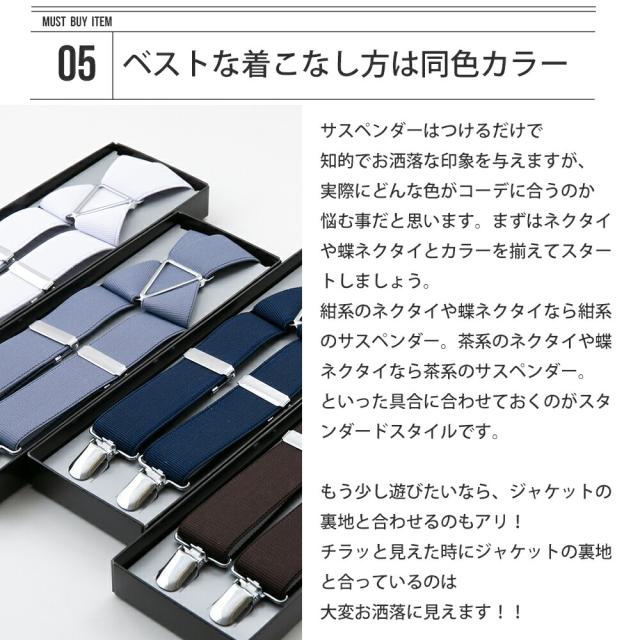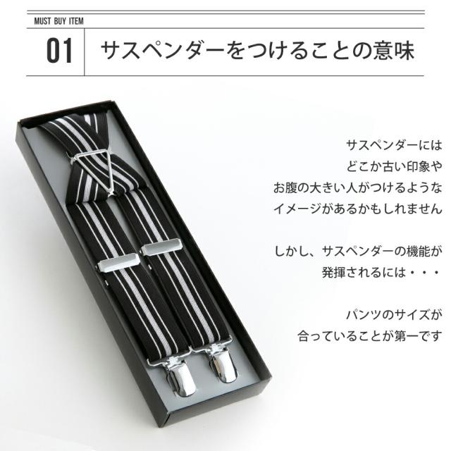 | 1.美シルエット フォーマルシーンはもちろん、ビジネス、カジュアルでも使えるサスペンダー。 ベルトを使わず、美しいシルエットを保つことができます。 SCENE:ビジネス、結婚式、二次会、パーティ、フォーマル、忘年会、新年会 2.足長効果 ベルトと違って足が長く見える効果があります。 |