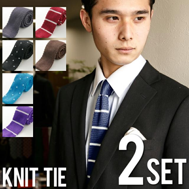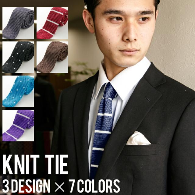 【送料無料】ニットタイ 無地 ドット ボーダー ネクタイ 紺 黒 ネイビー ワイン グレー ブラウン ターコイズ パープル ポリエステル ナロー 6cm クールビズ ビジネス カジュアル
