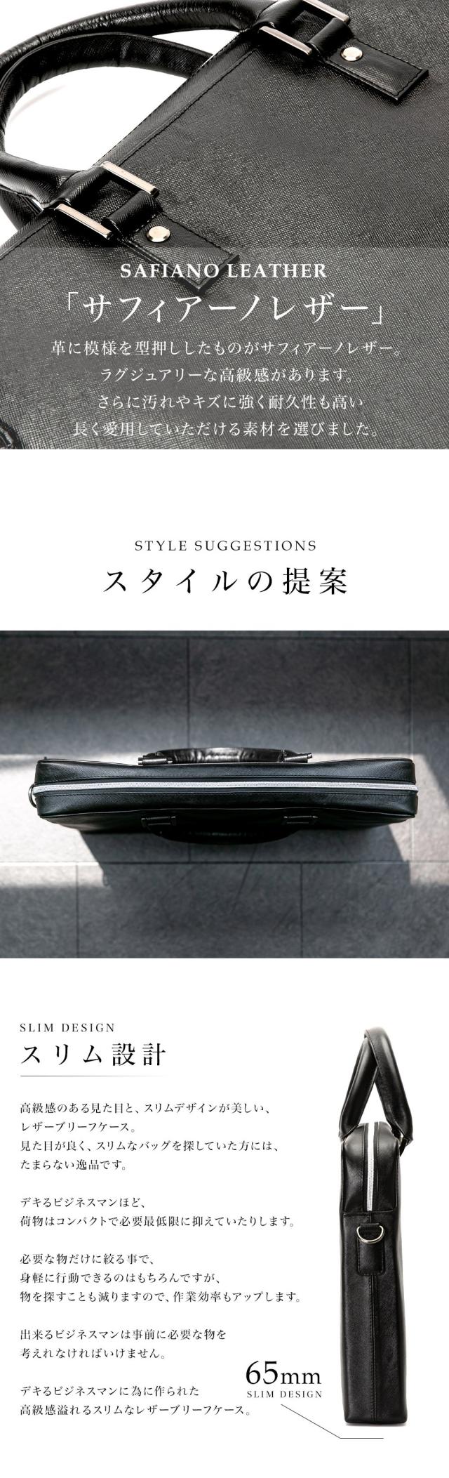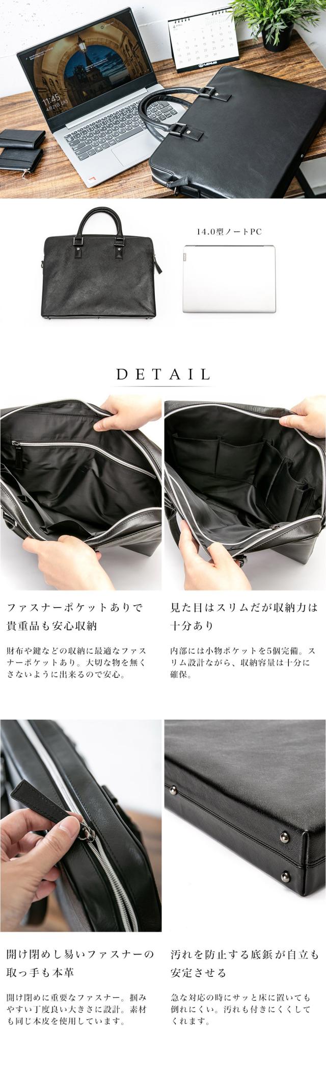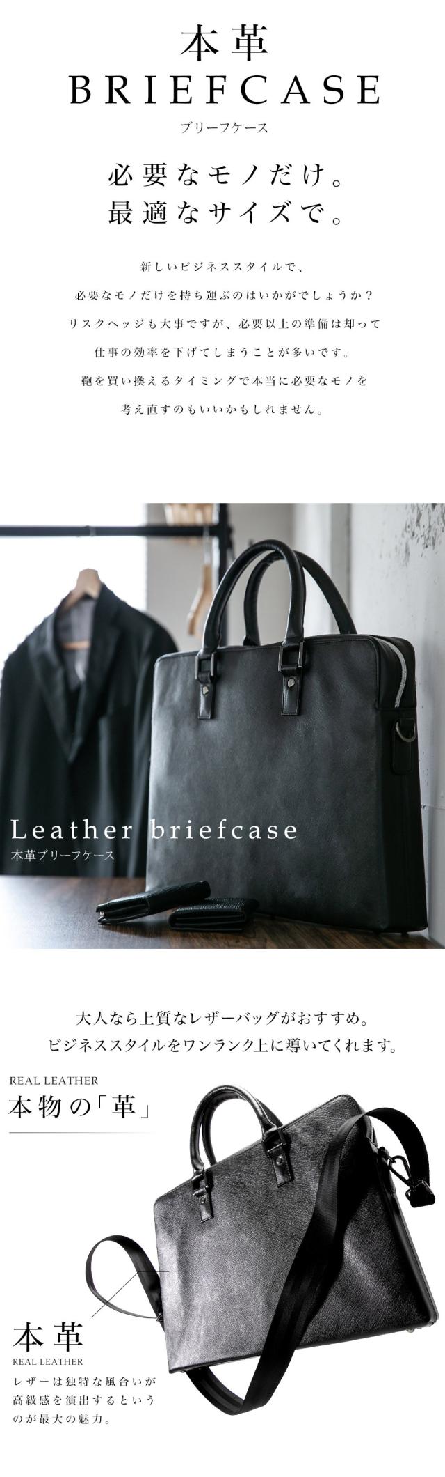 デザインと機能性を兼ね備えたスリム設計の本革製ビジネスバッグ。誕生日や父の日のプレゼント、就職祝いのギフトとしておすすめ。