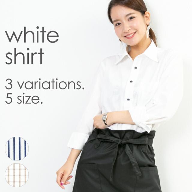 【送料無料】シャツ レディース ブラウス 長袖 白 ネイビー ベージュ おしゃれ 無地 ストライプ チェック ユニセックス ユニフォーム カフェ 仕事 ブロード レギュラー 綿 ポリエステル
